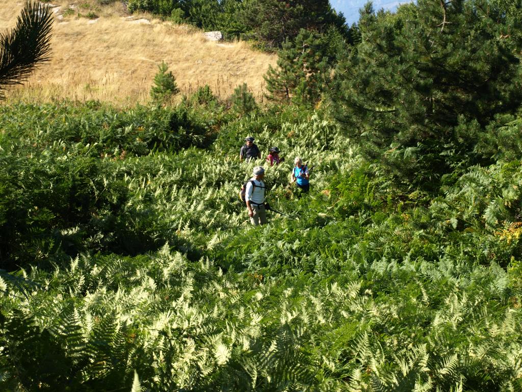 Εμείς συνεχίζουμε δεξιά μας με κατεύθυνση Νοτιοδυτική ΝΔ, τραβερσάροντας την Νοτιοανατολική πλευρά της κορυφής, από φαρδύ μονοπάτι ομαλά, και σε 400 μέτρα περίπου συναντάμε το μονοπάτι που κατεβαίνει από την κορυφή ((9α). Συνεχίζουμε σε δάσος από καλογραμμένο μονοπάτι, βγαίνουμε σε ξέφωτο με φτέρες και κέδρα και συναντάμε το μονοπάτι που ανεβαίνει στην κορυφή από τις σκάλες.