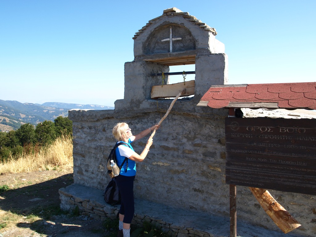 Συνεχίζουμε, ανεβαίνουμε με προσοχή τον πρώτο βράχινο τοίχο από σκάλα, (Οκτώ μέτρα ύψους περίπου, με είκοσι πέντε σκαλοπάτια), καταλήγουμε σε μικρό «Μπαλκόνι», ανεβαίνουμε για λίγο απότομα στην πλαγιά και καταλήγουμε σε στενό λαιμό σαράντα μέτρων περίπου, που αν και δείχνει ότι ήμαστε εκτεθειμένη είναι αρκετά φαρδύς και ασφαλής όταν δεν έχει χιόνι, τον περνάμε και καταλήγουμε στον τελικό βράχινο τοίχο που δημιουργεί το «μπαλκόνι» της κορυφής, περνάμε τον τοίχο από την δεύτερη μεταλλική σκάλα,(Περίπου τρία μέτρα ύψους ), με δέκα σκαλοπάτια και καταλήγουμε σε μικρό πλάτωμα που είναι κτισμένο το εκκλησάκι του Προφήτη Ηλία (8) σε υψόμετρο 1803Μ.
