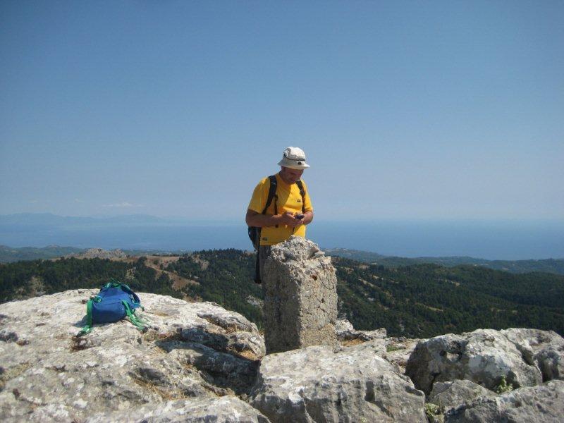 Όταν ξαναβγήκαμε στην άσφαλτο κοντά στο κτίριο του Δασαρχείου είδαμε στην άλλη μεριά του δρόμου ξεκίνημα μονοπατιού με σκαλάκια και μια ταμπέλα που έλεγε ότι το μονοπάτι οδηγούσε στο «Ξηρό όρος». Ούτε ήξερα ότι υπήρχε τέτοιο βουνο. Δεν θέλαμε και πολύ να το αποφασίσουμε. Είχα και το gps στο αμάξι για να καταγράψω τη διαδρομή. Το μονοπάτι ξεκινάει από τα 650 μ. περίπου και κινείται μέσα σε όμορφο ελατόδασος. Στην αρχή είναι κι αυτό διαμορφωμένο με ξύλινα κάγκελα, γεφυράκια, κλπ. Είναι όπως καταλαβαίνετε σαφέστατο και καλά σηματοδοτημένο. Μετά από 15’ περίπου φτάνουμε σε χωματόδρομο και τον ακολουθούμε προς τα αριστερά για 250 μ. περίπου. Ξαναπαίρνουμε το μονοπάτι προς τα δεξιά και σε 5’ περίπου φτάσαμε σε πλάτωμα με διαμορφωμένο χώρο αναψυχής, με κούνιες και τραπέζια, δίπλα σε δρόμο. Το μονοπάτι δεν ακολουθεί το δρόμο αλλά στρίβει δεξιά και συνεχίζει να κινείται ανηφορικά μέσα στο όμορφο ελατόδασος. Σε 45’ περίπου βγήκαμε στη γυμνή κορυφογραμμή και την ακολουθήσαμε (για πολύ λίγο) μέχρι την κορυφή (990μ.) με το κολωνάκι και την όμορφη θέα από τον Ευβοϊκό μέχρι το Αιγαίο και από το Καντήλι και τη Δίρφη μέχρι το Πήλιο και τον Άθω. Δεν κάναμε πάνω από 1:15’ πολύ τεμπέλικης και πολύ όμορφης διαδρομής για να φτάσουμε στη κορυφή.
