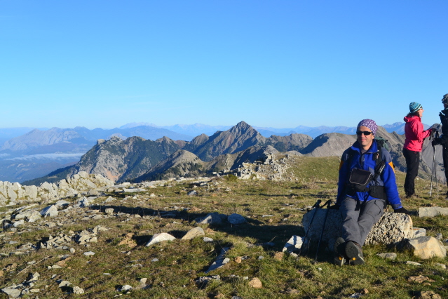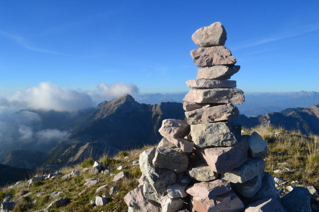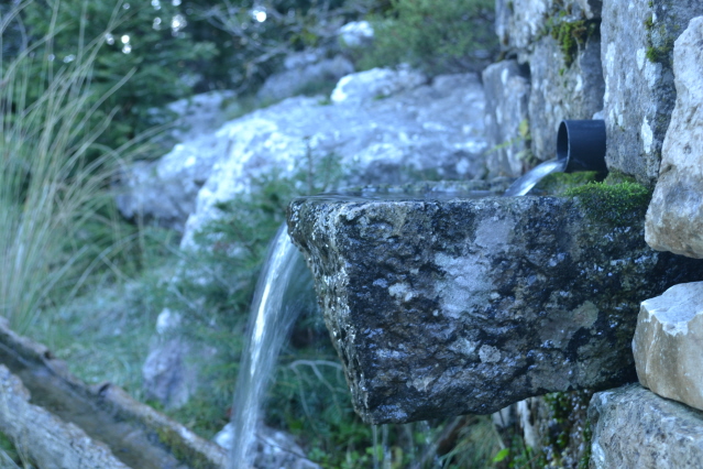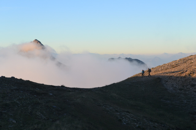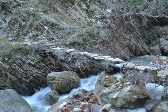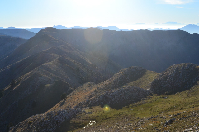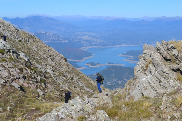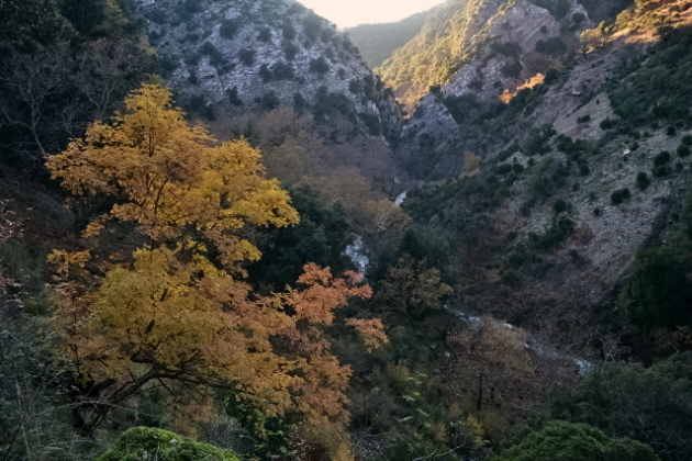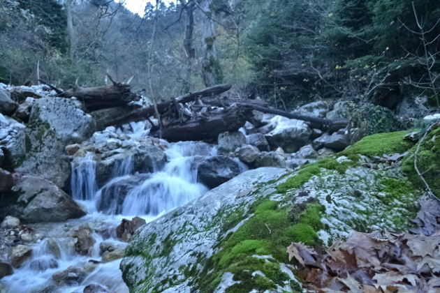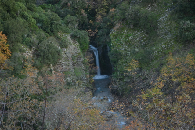 Την επόμενη μέρα , δεν πήραμε το δρόμο προς την Πάνω Αρέντα και το διάσελο, αλλά με τις οδηγίες του κυρ Λάμπρου ακολουθήσαμε τις κολώνες τις ΔΕΗ που πάνε προς την κορυφογραμμή της Καταβόθρας. Όταν βγήκαμε ψηλά το πρώτο φως έλουζε τις χτεσινές κορυφές. Η καθαρή ατμόσφαιρα έκανε το περπάτημα πάνω στη κορυφογραμμή της Καταβόθρας εξαιρετικό. Σε 1.30 από το χωριό στεκόμασταν στα 1752 της κορυφής της. Στη συνέχεια έπρεπε να ακολουθήσουμε τη κορυφογραμμή προς την Τσίνα, έτσι πήραμε τον κατήφορο για το διάσελο και σε 1.30 περίπου ώρα φτάσαμε κάτω από την Τσίνα. Για να κερδίσουμε λίγο χρόνο την παρακάμψαμε και κινηθήκαμε πάλι πάνω στη κορυφογραμμή προς το "σύνορο", ξερολιθιά πάνω στην κορυφογραμμή που οριοθετεί τα σύνορα του Λαμπιριού. Εκεί έρχεται το μονοπάτι από τον Κατελάνο και το ακολουθήσαμε για λίγο. Μετά το κατέβασμα μέχρι το ξέφωτο πάνω στον μικρό ώμο, πήραμε το φανερό μονοπάτι που φεύγει δεξιά μέσα στο δάσος και οδηγεί στο ξέφωτο της Φτέρης. Το μονοπάτι μετά από λίγο χάνεται, αλλά οι κορδέλες στα δέντρα κι ο Δημήτρης μας βοήθησαν να φτάσουμε στη Φτέρη σε λιγότερο από 1 ώρα από τη διασταύρωση και 7 περίπου από την Αρέντα. Από τη Φτέρη πήραμε το παλιό μονοπάτι, που σε πολλά σημεία έχει χαθεί, αλλά με τη προσπάθεια των Αγρινιωτών, έχει αρχίσει να διακρίνεται και πάλι. Σε λιγότερο από 1 ώρα φτάσαμε δίπλα στο ρέμα και το ακολουθήσαμε για λίγο από τη δεξιά πλευρά του. Λίγο πριν περάσουμε στην αριστερή μεριά εμφανίστηκαν και τα φρεσκοβαμμένα κόκκινα σημάδια. Από εκεί και μετά το μονοπάτι αφήνει το ρέμα κι ανεβαίνει ψηλότερα. Η διαδρομή είναι φανταστική καθώς έχει συνέχεια το ρέμα από κάτω και περνά από μπαλκόνια, ρεματάκια, καταρράκτες και απότομα βράχινα περάσματα. Στο τέλος ένα ιδιόμορφο γεφυράκι από σωλήνες και πλάκες μας βοηθά να περάσουμε στην απέναντι όχθη και να βρεθούμε σε 20΄ στο τέλος του δρόμου που έρχεται από τη Σιτόμενα, 3-4 χλμ παρακάτω. Εκεί μας περίμενε ο Θύμιος, που με το φορτηγάκι του θα μας πήγαινε πίσω στον Αγ. Βλάσση και στα αυτοκίνητά μας, πάνω από 1 ώρα δρόμος. Τον ευχαριστούμε κι αυτόν.