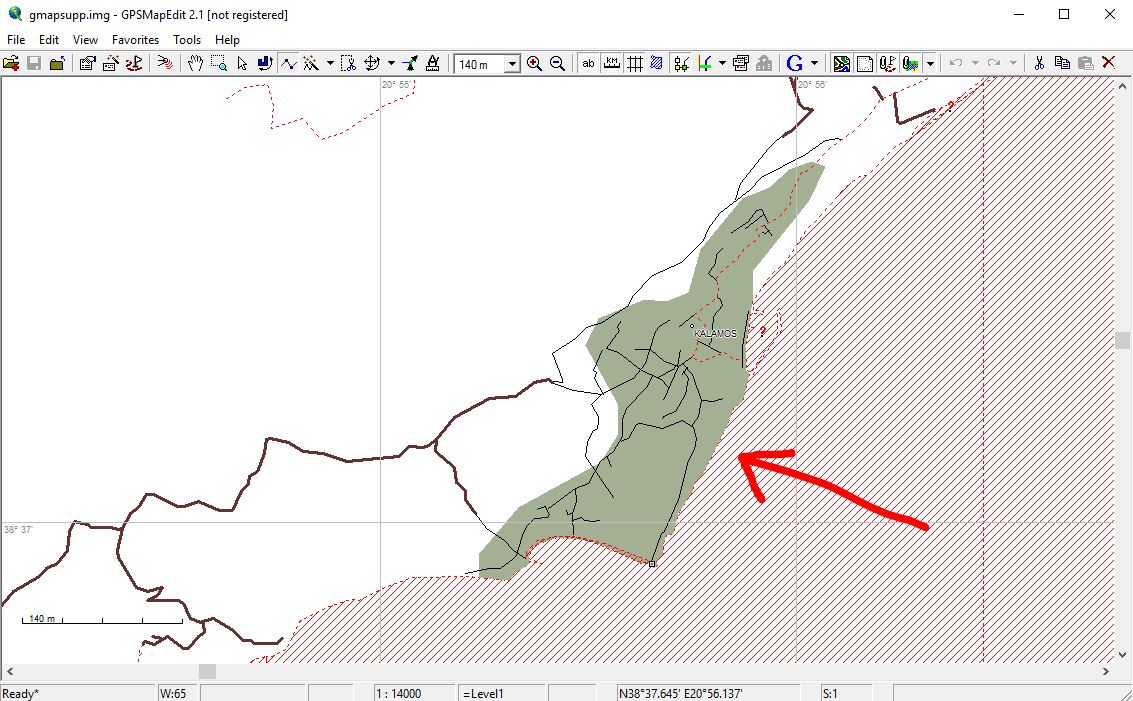 Οι περιοχές που στο gpsmapedit εμφανίζονται με γκρι και πράσινο χρώμα, στο gps εμφανίζονται με γαλάζιο χρώμα. Με αποτέλεσμα να μη ξεχωρίζουν από τη θάλασσα.