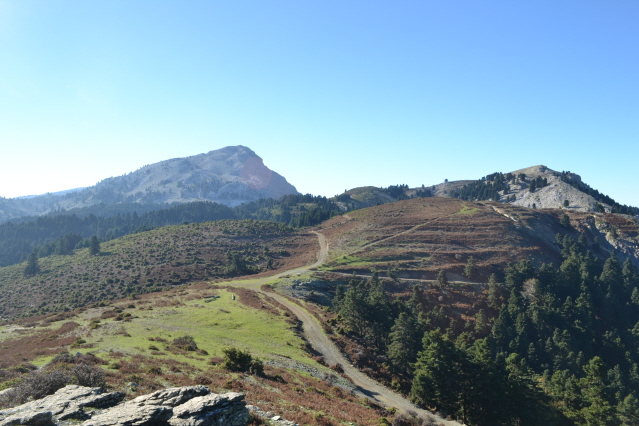 Είμαι σε μια ανώνυμη ξεκομμένη κορυφή στα 1080μ. υψόμετρο η οποία βρίσκεται βόρεια της κορυφογραμμής Τρείς Κορυφές-Προφήτησ Ηλιάς(η ψηλότερη του βουνού).Η κορυφή που φαίνεται στα κέντρο είναι η μεσαία και υψηλότερη(κάπου 1370μ.) έξαρση στη διαδρομή Τρείς Κορυφές-Προφήτης Ηλίας. Βάζω άλλη μια φωτογραφία με πιο ευρυγώνιο πλάνο για να καταλάβατε το σημείο