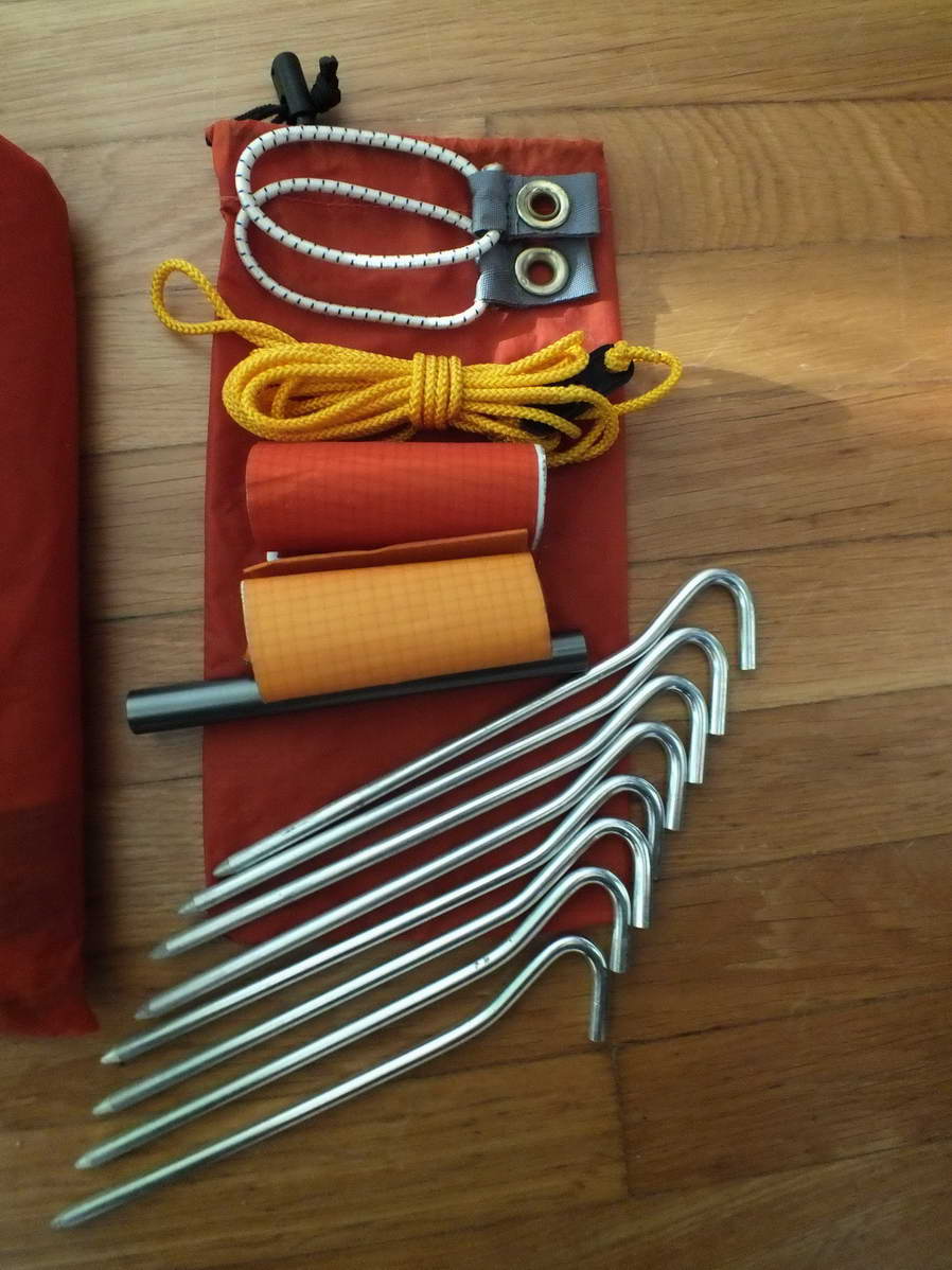 Field repair kit, pegs, guy line and tensioners, elastic peg points