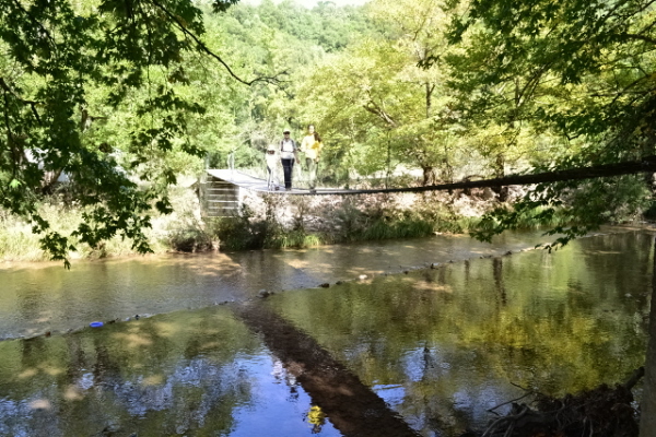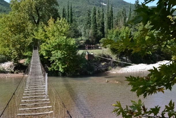 Το κλου βέβαια του ποταμού είναι η συρμάτινη κρεμαστή γέφυρα αλά Ιντιάνα Τζόουνς και κυρίως το καρέλι, που ξεκινούν και τα δύο από μέσα από την κατασκήνωση. Είναι και τα δύο λειτουργικά και απολύτως ασφαλή. Στο καρέλι (που χωράει άνετα 1 μεγάλος και 2 παιδιά) καλύτερα να μη μπουν τα πιτσιρίκια μόνα τους, γιατί μετά την αρχική πλάκα του ξεκινήματος που το αφήνετε και φεύγει σφαίρα με σάς μέσα, σταματάει κρεμασμένο στη μέση του ποταμού και θέλει να τραβήξεις το σχοινί που θα το πάει απέναντι. Οπότε αν πάνε πιτσιρίκια μόνα τους, μπορεί να μην έχουν τη δύναμη για να τραβήξουν το σχοινί και να μείνουν αμανάτι στον αέρα στη μέση του ποταμού κι εσείς να ψάχνετε σκάλα για να ανέβετε να σώσετε τα πιτσιρίκια και το καρέλι.