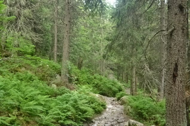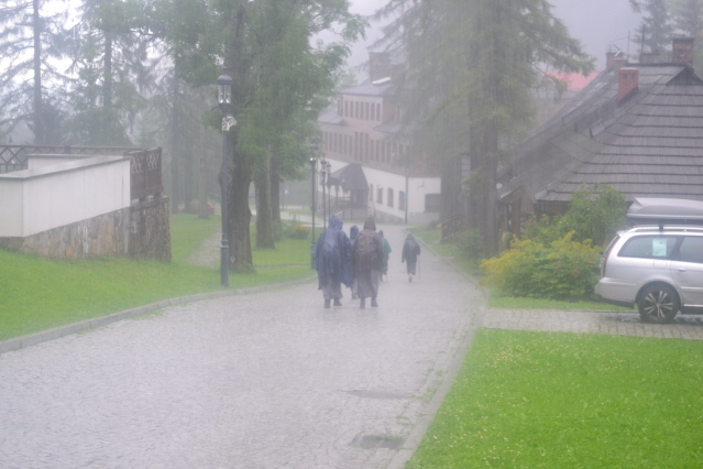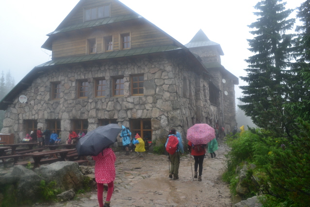 Στη Πολωνία κατευθυνθήκαμε στη πόλη Zakopane, το μεγαλύτερο ορεινό θέρετρο. Μείναμε σ' ένα από τα πολλά κάμπινγκ που θύμιζε βούρκο από τη πολύ βροχή. Ο κόσμος ήταν απίστευτα πολύς και στο κεντρικό πεζόδρομο νόμιζες οτι ήσουν στην Ερμού σε περίοδο εκπτώσεων. Τα ορειβατικά μαγαζιά άπειρα με όλα τα καλούδια που ξέρουμε, αλλά και με πολλές πολωνικές φίρμες κυρίως σε ρούχα και παπούτσια, σε πολύ προσιτές τιμές. Ο καιρός εξακολουθούσε να είναι άστατος με πολύ βροχή κατά διαστήματα. ΄Στην άκρη της πολής υπάρχει η τοποθεσία Kuznice 1020μ, απ' όπου ξεκινούν όλα τα μονοπάτια και φεύγει τελεφερίκ που σε βγάζει στα 2000μ στη κορυφογραμμή των συνόρων. Την επόμενη της άφιξης μας δεν αντέξαμε στο καθισιό κι είπαμε να πάμε μέχρι ένα καταφύγιο στα 1500μ, ότι καιρό και νά χει. Ξεκινήσαμε από το Kuznice λοιπόν κι αφού πληρώσαμε λιγότερο από 4€ για την είσοδό μας στο πάρκο ακολουθήσαμε το κίτρινο μονοπάτι, που μέσα στο ψιλόβροχο μας έβγαλε σε λιγότερο από 2 ώρες στη διασταύρωση με το μπλέ μονοπάτι στα 1500μ. Στη συνέχεια σε 20΄ φτάσαμε στο επιβλητικό καταφύγιο Schronisko Murowaniec, όπου γινόταν χαμός από κόσμο. Αφού μετά από πολύ αναμονή βρήκαμε μια γωνίτσα για να κάτσουμε και να στεγνώσουμε πήραμε το δρόμο της επιστροφής από το μπλε μονοπάτι αυτή τη φορά, χωρίς να γλιτώσουμε τη καθημερινή μας μπόρα.