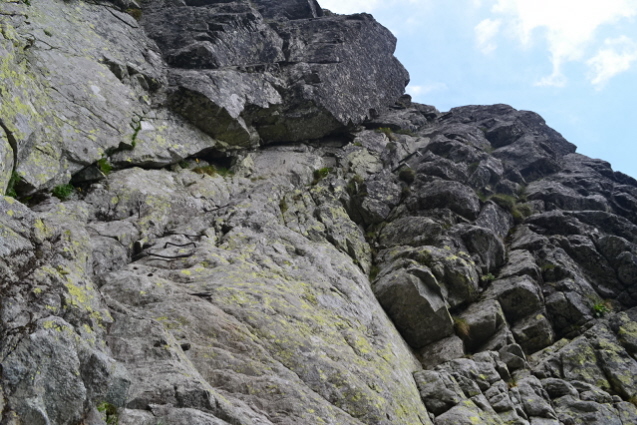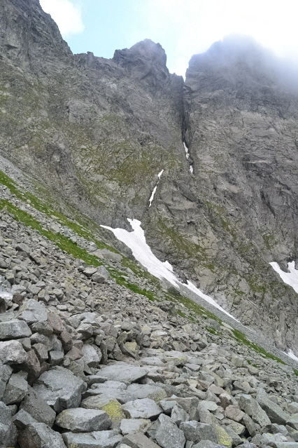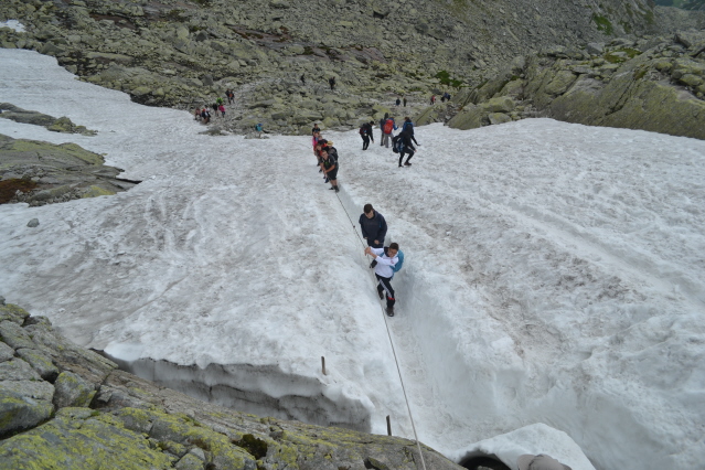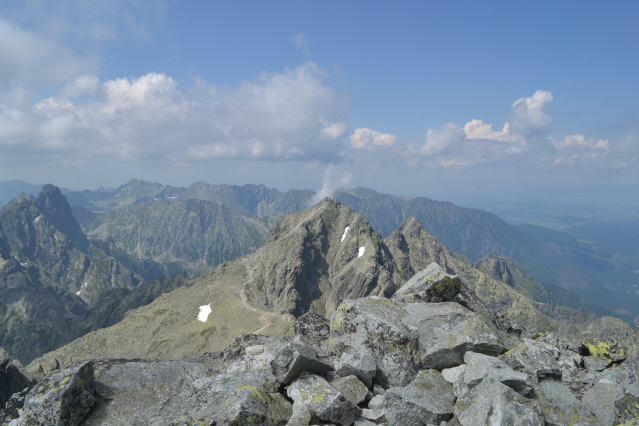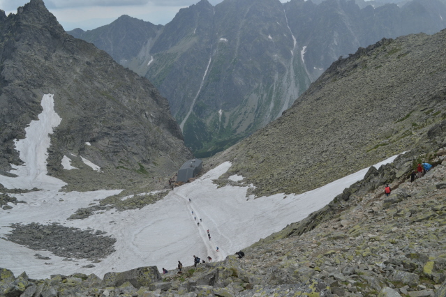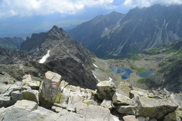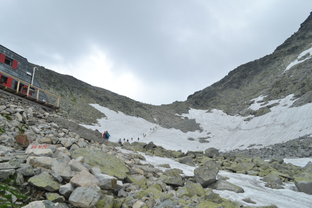 Τη πρώτη μέρα λοιπόν ξεκινήσαμε από το θέρετρο Strbske Pleso (Pleso σημαίνει λίμνη) 1350μ με στόχο τη λίμνη Popradske Pleso 1500μ και το ομώνυμο καταφύγιο. Όλοι μαζί φτάσαμε εκεί σε κάτι περισσότερο από 1 ώρα. Στη συνέχεια μόνος πια συνέχισα προς το καταφύγιο Chata pod Rysmi 2250m. Η διαδρομή ακολουθεί μια κοιλάδα, περνά από 2 μικρές όμορφες λιμνούλες, για να βγει στο πιο απότομο σημείο, που είναι ένα βράχινο σκαλοπάτι, ασφαλισμένο με αλυσίδες και σιδερένια σκαλοπάτια. Λίγο πριν το καταφύγιο υπήρχε και μια μεγάλη χιονούρα που ήταν σκαμένο ένα τεράστιο αυλάκι από τα πόδια των χιλιάδων καθημερινών επισκεπτών. Και είναι χιλιάδες, καθώς όλοι οι Σλοβάκοι πρέπει να πέρνουν τα βουνά. Μετά το καταφύγιο ακολουθούσε άλλη μια χιονούρα πριν το διάσελο Vaha 2340m. Μέχρι εκεί πήγαιναν όλοι και στη συνέχεια έφευγαν αριστερά προς τη κορυφή Rysy 2500m, στα σύνορα με τη Πολωνία και ψηλότερη κορυφή της Πολωνίας. Εγώ όμως είχα στο μυαλό μου να την ανέβω από τη Πολωνία. Κι έτσι από το διάσελο έφυγα δεξιά με στόχο την πιο αναρριχητική κορυφή Vysoka 2547m. Από το διάσελο και μετά δεν υπάρχουν σημάδια καθώς είναι από τις κορυφές που δεν είναι προσβάσιμες σ' όλους. Αλλά με λίγη εμπειρία μπορείς να βρεις τη σωστή διαδρομή που τραβερσάρει τη πλαγιά μέχρι ένα μικρό διασελάκι, που για να το ανέβεις έχει αλυσίδες. Από το διασελάκι πρέπει να γυρίσεις από την άλλη μεριά και να μπεις σ' ένα λούκι που κρατούσε ακόμη χιόνι. Χωρίς να έχω προνοήσει για κραμπών ή πιολέ, μπήκα στο λούκι και με πολύ προσοχή διάσχισα τη χιονούρα 2 φορές κι από τα βράχια, περνώντας κι από ένα σημείο με σιδερένια σκαλοπάτια έφτασα στη κορυφή. Επιστροφή από τα ίδια στα 2 καταφύγια και στην Strbske Pleso, ενώ έχει κι εναλλακτικά να γυρίσεις κι από άλλες διαδρομές.
