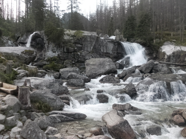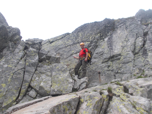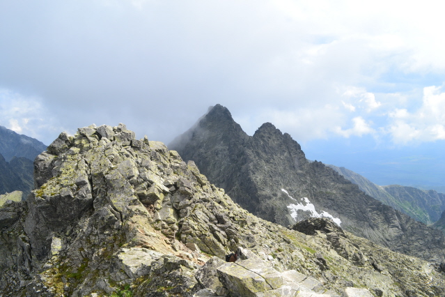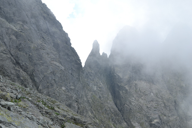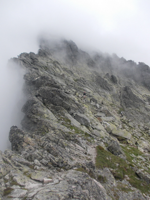Η επόμενη μέρα ξημέρωσε ηλιόλουστη και ξεκίνησα από το πολύ όμορφο χωριό Stary Smokovec 1020m, για την ψηλότερη κορυφή Gerlachovsky Stit 2655m. Η διαδρομή ανεβαίνει ομαλά από ένα μονοπάτι μέσα στο δάσος και σε λιγότερο από 2 ώρες έφθασα στο ορεινο ξενοδοχείο Sliezsky Dom και στη μικρή λιμνούλα δίπλα του στα 1667μ. Στη συνέχεια το μονοπάτι κινείται γύρω από τη λίμνη και βγαίνει δίπλα και πάνω από τους καταρράκτες που την τροφοδοτούν. Οι οδηγίες μου έλεγαν οτι μόλις περάσω τους καταρράκτες πρέπει να περάσω το ποταμάκι και να μπω στο μονοπάτι της κορυφής. Το έκανα και για λίγο ανησύχησα καθώς δεν υπήρχε πουθενά πινακίδα ή σημάδια. Επίσης από το πρωί δεν είχα δει άνθρωπο πουθενά και μου φάνηκε περίεργο. Συνεχίζοντας έπεσα σε ένα μικρό ξεκάθαρο μονοπατάκι και το ακολούθησα αφού κινούνταν στη σωστή κατεύθυνση. Σε λιγότερο από μισή ώρα με έβγαλε μέσα σε ένα βραχώδες λούκι, όπου είδα στη δεξιά πλευρά του κάποια σιδερένια σκαλοπάτια και σιδερένια παλούκια. Βρίσκομαι σωστά σκέφτηκα και ξεκίνησα να ανεβαίνω. Βγαίνοντας πάνω από τα βράχια το μονοπάτι συνεχίζει πάλι ξεκάθαρο και κινείται πάνω στη ράχη-φρύδι του λουκιού με σαφή κατεύθυνση ένα διασελάκι πάνω στη κορυφογραμμή. Στη πορεία συννάντησα πολλά μονοπατάκια, αλλά΄από διαίσθηση είχα βάλει στόχο το διασελάκι-πέρασμα και κινούμουν προς τα εκεί. Πρίν φτάσω εκεί με επισκέφθηκε ο "ξενοδόχος" που είχα αναφέρει νωρίτερα. Σιγά σιγά τα λίγα σύννεφα έγιναν πολλά και κατέκλησαν όλο το βουνό. Με μικρή ορατότητα συνέχισα μέχρι το διασελάκι και αφού έψαξα λίγο τριγύρω κατέληξα στο συμπέρασμα οτι η διαδρομή περνούσε από τη πίσω μεριά. Όντως μετά από λίγο βρήκα ένα πέρασμα εξοπλισμένο με σίδερο και συνέχισα τραβερσάρωντας τη πλαγιά. ΒΓήκα σ' έναν ώμο και κατέβηκα λίγο, πριν μπω σ' ένα ανοιχτό λούκι που με έβγαλε στη κορυφογραμμή. Στο μεταξύ ψυχή στο βουνό και η ομίχλη να ανοίγει και να κλείνει. Στη κορυφογραμμή συνέχισα μέχρι που βγήκα σε πλαγιά. Την ανέβηκα και βγήκα πάλι σε βραχώδη κορυφογραμμή-χτένι. Συνέχισα πάνω της με scrambling και σύντομα φτάνωντας στα 2600μ είδα μακρυά το σταυρό της κορυφής. Αναθάρρησα και συνέχισα. Σύντομα όμως άρχισαν τα μπουμπουνητά πιο μακρυά. Αμέσως μπήκα σε σκέψεις. Μέχρι τη κορυφή είχε ακόμη μπόλικη δουλειά, γιατί το χτένι απαιτούσε συνεχή ανέβα κατέβα. Το σκέφτηκα λίγο κι αποφασισα να γυρίσω. Τα μπουμπουνητά όλένα και πλησίαζαν κι ενώ βρισκόμουν πάνω στη κορυφογραμμή άκουσα τα μπατόν στο σακίδιο μου να βουίζουν, όπως τα καλώδια υπερηψηλής τάσης. Αμέσως πέταξα το σακίδιο μακρυά και κατέβηκα στη πλαγιά. Αφού περίμενα για κάμποση ώρα πήγα και το ξαναπήρα και βγάζοντας τα μπατόν, για να μην είμαι σαν "αλεξικέραυνο" συνέχισα με γρήγορο βήμα. Πριν φτάσω στο διασελάκι πέρασμα, άρχισε η βροχή κι οι αστραπές ήταν τώρα ορατές. Αποφάσισα να αφήσω τα μπατόν και το σακίδιο και να ψάξω να βρω καταφύγιο. Τελικά το μόνο που βρήκα ήταν μια μικρή εσοχή του βράχου, όπου την έβγαλα για 1 ώρα όρθιος με τα αστραπόβροντα γύρω μου να θυμίζουν εμπόλεμη ζώνη. Αφού πέρασε η καταιγίδα μάζεψα τα υπάρχοντα μου και πήρα το κατήφορο. Μέχρι να γυρίσω στο χωριό η βροχή δεν με ξέχναγε. Γυρίζοντας στο χωριό είδαμε οτι ο καιρός θα ήταν άσχημος για πολλές ακόμα μέρες κι έτσι αποφασίσαμε να την κάνουμε για το Poprad, πρωτεύουσα της περιοχής.