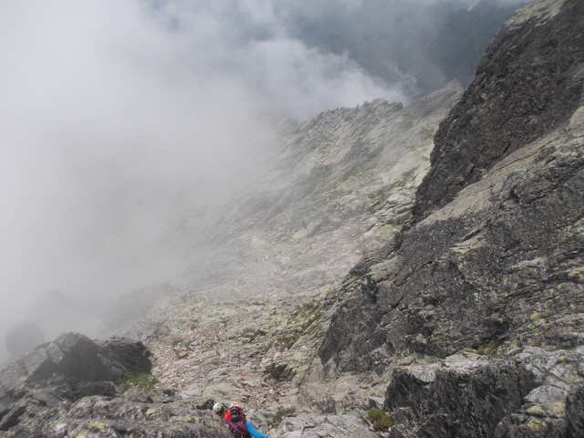 Γυρίζοντας στη Σλοβακία και με πρόγνωση για καλύτερο καιρό - επιτέλους, είπα να κάνω τη δεύτερη ψηλότερη της Σλοβακίας, την Lomnicky Stit 2634m. Μέχρι τη κορυφή μπορείς να ανέβεις και με τελεφερίκ από την Tatranska Lomnica 900m, αλλά εγώ προτίμησα να ανέβω με τελεφερίκ μέχρι την Skalnate Pleso 1750m κι από εκεί από τη βράχινη κόψη. Από το σταθμό του τελεφερίκ λοιπόν ακολούθησα το μονοπάτι που πάει στο διάσελο Lomnicke Sedlo 2190m-εκεί πάει και καρεκλάκι. Από εκεί και μετά πάλι δεν έχει σημάδια γιατί δεν είναι εύκολη διαδρομή. Από το διάσελο φεύγεις λοιπόν επάνω στη πλαγιά σε εμφανές μονοπάτι. Σε 30΄ φτάνεις σε βράχια που με λίγο scrambling τα ξεπερνάς και βγαίνεις στη βράχινη κόψη. Την ακολουθείς για λίγο και στη συνέχεια τραβερσάρεις μέσα στο λούκι που κατεβαίνει από τη κορυφή. Βέβαια για να μην ξεχνιόμαστε πάλι έκλεισε ο καιρός και η ορατότητα ήταν πολύ περιορισμένη. Ευτυχώς μαζί μου ανέβαιναν και 3 Σλοβάκοι, που κι αυτοί πήγαιναν στα ψαχτά. Μπαίνοντας στο λούκι συναντάς έναν βράχινο τοίχο εξοπλισμένο με αλυσίδες. Τον ανεβαίνεις και ξαναβγαίνεις στη κόψη, λίγο πριν τη κορυφή. Με εύκολο σκαρφάλωμα βγαίνεις στη κορυφή που είναι κατακλισμένη από κτίρια, αλλά και όμορφα μπαλκόνια για να απολαύσεις τη θέα (ποιά θέα θα μου πεις;;;). Συνολικά 2 ώρες από το σταθμό του τελεφερίκ. Επιστροφή από την ίδια διαδρομή μέχρι τη Skalnate Pleso κι επειδή ο καιρός στα χαμηλά ήταν ανοιχτός είπα να κατέβω από το μονοπάτι που κάνει κύκλο και περνά από μια όμορφη κοιλάδα, την Studena. Αμέσως κάτω από το σταθμό του τελεφερίκ υπάρχει το καταφύγιο Skalnate 1750μ κι από εκεί το μονοπάτι τραβερσάρει όλη τη πλαγιά με υπέροχη θέα στη πεδιάδα. Μετά από 1 ώρα περίπου έφτασα στο πανέμορφο καταφύγιο Zamkovskeho 1460m και μπήκα στη κοιλάδα Studena, με το ποτάμι που σχηματίζει πολλούς καταρράκτες. Ακολουθώντας πιστά τις κατατοπιστικές πινακίδες σε κάθε διασταύρωση, μετά από 1,5 ώρα επέστρεψα στη βάση του τελεφερίκ στην Tatranska Lomnica