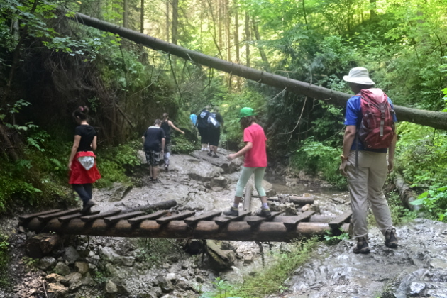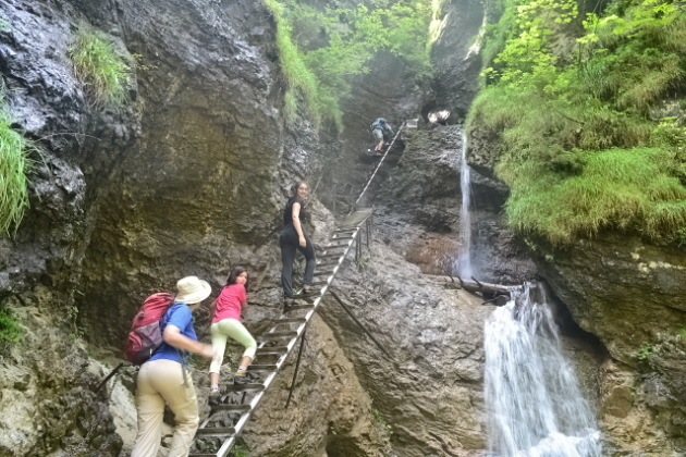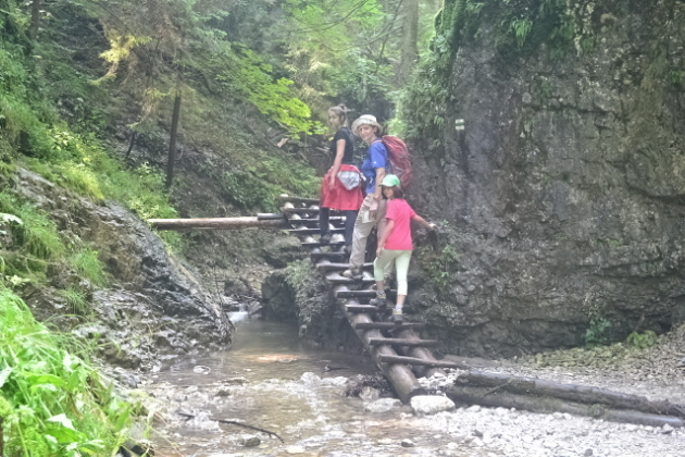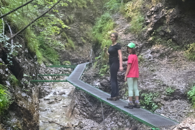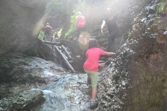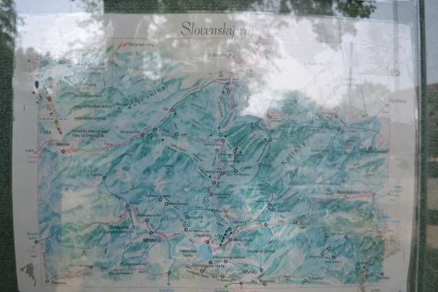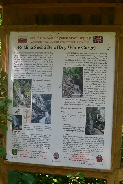 Για τις τελευταίες μέρες πριν φύγουμε από την περιοχή των Tatras αφήσαμε το πάρκο με το πολύ πιασάρικο όνομα Slovensky Raj (Σλοβακικός Παράδεισος). Πρόκειται για μια περιοχή 20χλμ περίπου νότια από τα Tatras, με χαμηλά βουνά με πυκνά δάση και πολλές ρεματιές και φαράγγια, όπου υπάρχουν 100άδες χλμ μονοπατιών. Εμείς διαλέξαμε το βόρειο κομμάτι του πάρκου στο κάμπινγκ Podlesok 550m. Φτάσαμε νωρίς το πρωί και η ηλιόλουστη μέρα μας παρακίνησε να ξεκινήσουμε αμέσως για το πολύ δημοφιλές φαράγγι Sucha Bela. Τελείωνοντας το φαράγγι θα περνάγαμε από το καταφύγιο Klastorisko και κάνοντας έναν μεγάλο κύκλο θα επιστρέφαμε από το φαράγγι Hornadu. Πληρώνοντας 4€ είσοδο μπήκαμε στο Άσπρο φαράγγι και αμέσως αρχίσαμε να το διασχίζουμε δεξιά αριστερά από διαμορφωμένους κορμούς δέντρων κι από σιδερένιους διαδρόμους. Φτάνοντας στα στενότερα σημεία του υπήρχαν αλλεπάλληλες σιδερένιες σκάλες από κάθετες μέχρι με μεγάλη κλίση. Μετά από 2,5 ώρες περίπου φτάσαμε στην έξοδό του κι ακολουθήσαμε διαδρομή σε δασικόύς δρόμους και μονοπάτια που σε 1 ώρα μας έβγαλαν στα ξέφωτα του καταφυγίου Klastorisko. Αφού απολαύσαμε τον ήλιο ξεκινήσαμε για να ολοκληρώσουμε το κύκλο. Είχε μεσημεριάσει όμως και τα βαριά σύννεφα δεν άργησαν να εμφανιστούν. Πριν προλάβουμε να απομακρυνθούμε μισή ώρα από το καταφύγιο άνοιξαν οι ουρανοί. Όπως όπως καλυφθήκαμε κάτω από τα δέντρα και περιμέναμε να κόψει η βροχή. Μουσκεμένοι κατεβήκαμε τη πλαγιά και φτάσαμε στην αρχή του φαραγγιού του Hornadu, που κατέβαινε λασπωμένος. Δυστυχώς δεν είχαμε άλλη επιλογή από το να συνεχίσουμε. Σε αρκετά σημεία τα περάσματα ήταν πάνω από σιδερένιες σχάρες πάνω από το ορμητικό ποτάμι. Μπήκαμε και σε 1 ώρα περίπου φτάσαμε στο γεφύρι του μύλου. Εκεί άνοιξαν πάλι οι ουρανοί, αλλά ευτυχώς τώρα υπήρχαν κάποια σπίτια και μπήκαμε κάτω από τα υπόστεγά τους. Καθίσαμε πάνω από 1 ώρα και απελπισμένοι όταν έκοψε λίγο η βροχή ξαναβγήκαμε για να συνεχίσουμε. Δυστυχώς με το κεφάλι κάτω λόγω της βροχής χάσαμε κάποια διασταύρωση και κάνωντας κύκλο βγήκαμε σ' ένα άλλο χωριό κι αναγκαστήκαμε να γυρίσουμε στο κάμπινγκ με ταξί. Ας προσέχαμε, αφού τόσες μέρες ξέραμε οτι βρέχει κάθε μεσημέρι-απόγευμα.........