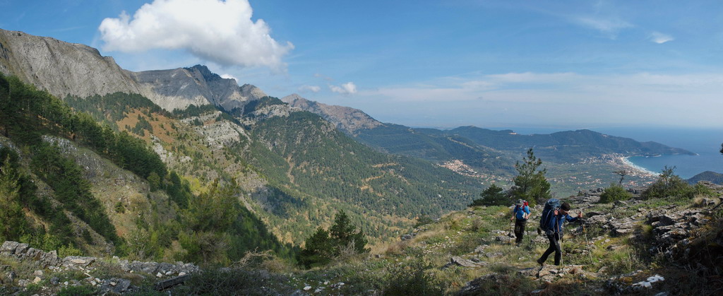 Καθώς ψηλώνουμε αρχίζουν να διακρίνονται από πάνω μας οι βράχινες κι απότομες πλαγιές του βουνού, ενώ σε αρκετά σημεία η πανοραμική θέα προς τον Όρμο της Ποταμιάς και την Χρυσή Ακτή μας προτρέπει σε συνεχείς στάσεις, ώστε να μπορέσουμε να την απολαύσουμε.