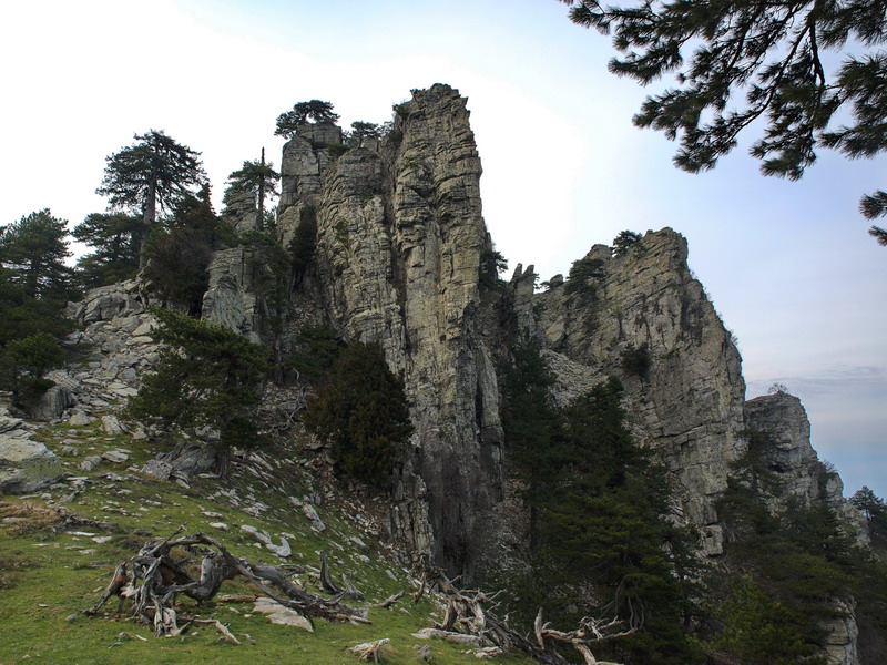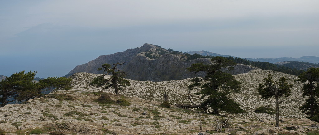 Αφού βγούμε στην κορυφογραμμή, στο βάθος διακρίνουμε την κορυφή του Υψάριου προς την οποία και κατευθυνόμαστε. Το τοπίο εδώ παρουσιάζει μια άγρια ομορφιά, με το έδαφος στο σύνολό του ν’ αποτελείται από βράχια. Ανάμεσά τους ξεπροβάλουν πεύκα στραβωμένα στην κυριολεξία από τους ισχυρούς ανέμους. Πολλά, στέκονται καμένα από τους κεραυνούς, που όπως είναι φανερό, πέφτουν συχνά σ’ ολόκληρη την περιοχή. Αλλά το πιο εντυπωσιακό είναι η απότομη ορθοπλαγιά, αποτελούμενη από συμπαγή βράχο, που δημιουργεί κάθετο τοίχο προς τη μεριά της θάλασσας, ενώ η άπλετη θέα δίνει την εντύπωση πως βρίσκεσαι πιο ψηλά, απ’ όσο στην πραγματικότητα είσαι.