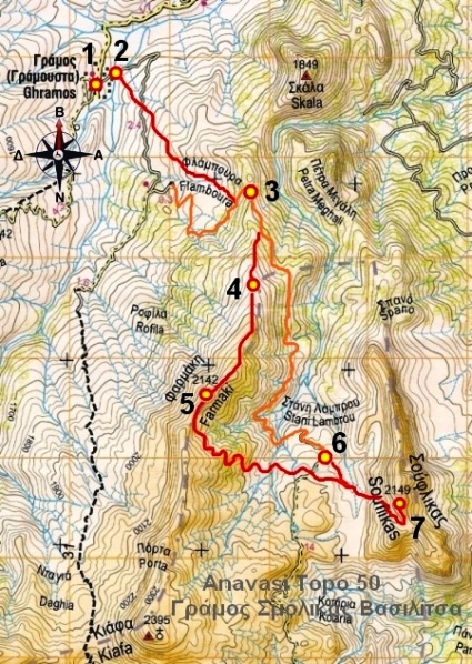Ξεκινάμε από την πλατεία του χωριού Γράμουστα (1) με υψόμετρο 1400Μ, κατηφορίζουμε με κατεύθυνση Βορειοανατολική ΒΑ προς το ποτάμι και περνάμε την γέφυρα (2) και αμέσως μετά την γέφυρα αφήνουμε τον δρόμο και ανηφορίζουμε στο πρανές από γελαδόστρατα με κατεύθυνση Νοτιοανατολική ΝΑ, περνάμε από μαντρί και χαλάσματα, φτάνουμε στον δρόμο τον διασχίζουμε και συνεχίζουμε στην πλαγιά, φτάνουμε σε ράχη έχοντας δεξιά χαμηλά κοιλάδα με στάνη και διακρίνουμε πλέων ψηλά Νοτιοανατολικά ΝΑ σέλωμα όπου ανεβαίνει ο δρόμος που είναι και ο προορισμός μας. Συνεχίζουμε τραβερσάροντας στην πλαγιά πότε ήπια και πότε έντονα, ώσπου καταλήγουμε στον δρόμο επάνω σε δεξιά φουρκέτα, συνεχίζουμε ανηφορίζοντας για 100 περίπου μέτρα και καταλήγουμε σε σέλωμα (3) που μας περνάει στο ρέμα και την κοιλάδα της «Στάνης Λαμπρού».
