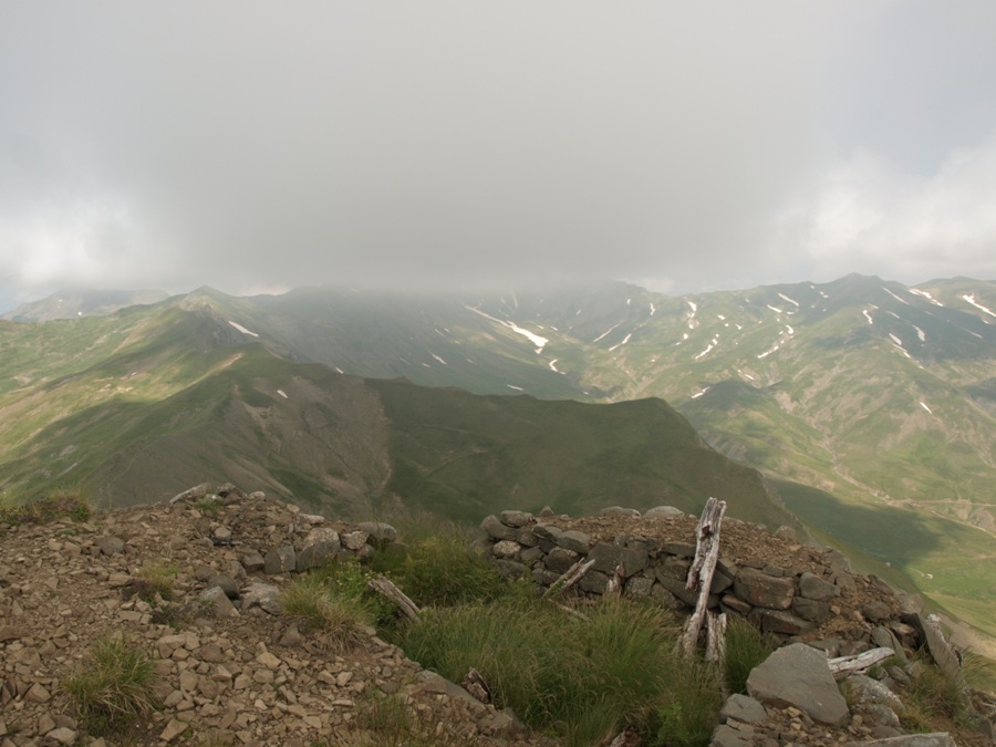 Με τον καιρό να συνεχίζει τα παιχνίδια του, έχοντας Ανατολικά την Κορυφή «Κιάφα» 2395Μ, που δεν την βλέπουμε από την ομίχλη, ανηφορίζουμε με Δυτική Δ κατεύθυνση, ακολουθώντας στην αρχή ομαλή ράχη και στην συνέχεια απότομα από κόψεις του αυχένα με ερείπια θέσεων μάχης από την εποχή του εμφυλίου πολέμου, ώσπου καταλήγουμε σε διάσελο και σε διασταύρωση με φαρδιά μονοπάτια (4). Ήμαστε στο διάσελο της «Περήφανο» σε υψόμετρο 2140Μ. Η διασταύρωση αριστερά μας Νότια κατεβαίνει σε 2,3Χμ., στην «Γκέσο», και δεξιά μας παρακάμπτει την κορυφή από τα ΒΑ για να καταλήξει στην 2520. Αγνοούμε το μονοπάτι και ανηφορίζουμε Δυτικά Δ σε ομαλή πλαγιά φτάνοντας σε κορυφή (5).
