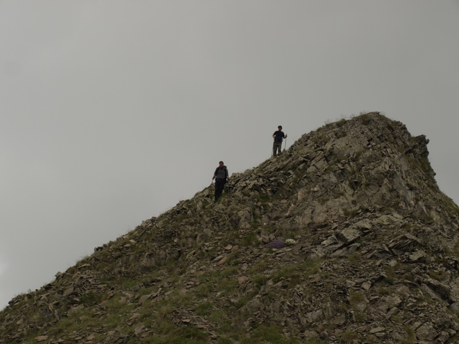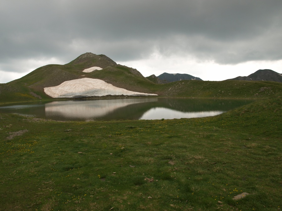 Η πορεία μας συνεχίζει Βόρια Β, στην ράχη της απότομης κορυφής με χαρακτηριστική «πυραμίδα» 2470Μ. Εδώ προσοχή ακολουθούμε αυστηρά το μονοπάτι που ακολουθεί την κόψη, αν παρακάμψουμε δεξιά για να αποφύγουμε την κορυφή, παρότι φαίνεται βατό έχει πολλές παγίδες από σαθρό έδαφος και η κλίση είναι αρκετά μεγάλη. Μετά την πυραμίδα κατεβαίνουμε συνεχίζοντας ακολουθώντας το χείλος του γκρεμού που έχουμε αριστερά μας ώσπου καταλήγουμε σε υψόμετρο 2360Μ σε αυχένα, με το μονοπάτι να στρίβει δεξιά Νοτιοανατολικά ΝΑ σε ομαλή πλαγιά έχοντας αριστερά μας την κορυφή 2400Μ και κάθετα βράχια τα οποία προσπερνάμε και καταλήγουμε σε υψόμετρο 2360Μ σε ομαλή πλαγιά. Συνεχίζουμε αλλάζοντας κατεύθυνση σε Βόρεια Β έχοντας δεξιά μας πλαγια και σε 0,5Χμ., περίπου καταλήγουμε σε λεκάνη όπου βρίσκετε η Αλπική λίμνη (8), με τα σύννεφα να έχουν «μολυβίαση», αλλά ευτυχώς έχουμε ορατότητα για να θαυμάσουμε το μεγαλείο αυτό της φύσης.