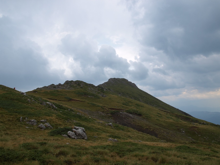 Συνεχίζουμε. Μπροστά από την βρύση στρίβουμε αριστερά Δυτικά Δ σε τρακτερόδρομο που ανηφορίζει στην πλαγιά έχοντας το δασόριο αριστερά, σύντομα φτάνουμε σε ρέμα και βράχια όπου συναντάμε τα πρώτα σημάδια (Κόκκινος κύκλος με λευκό στο κέντρο) σε ογκόλιθο ψηλά αριστερά. Περνάμε την ρεματιά και συνεχίζουμε στην ίδια κατεύθυνση, από φαρδύ μονοπάτι ώσπου σε υψόμετρο 1780Μ μπαίνουμε σε δάσος με οξιές. Συνεχίζουμε στο δάσος, βγαίνουμε σε ξέφωτο φτάνοντας σε ρεματιά και αλλάζουμε κατεύθυνση σε Νοτιοδυτική έχοντας την ρεματιά δεξιά, φτάνουμε σε λεκάνη που την κυκλώνουμε, ώσπου καταλήγουμε σε ράχη (3) έχοντας δεξιά μας οροπέδιο και αριστερά την ορθοπλαγιά, και μπροστά μας Νοτιοανατολικά ΝΑ την κορυφή.