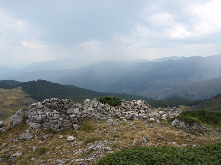 Από την κορυφή επιστρέφουμε με Βορειοδυτική ΒΔ κατεύθυνση προς την προκορφή και αφού περάσουμε τα ερείπια των οχυρώσεων σε υψόμετρο 2090Μ αλλάζουμε κατεύθυνση σε Δυτική Νοτιοδυτική ΔΝΔ και κατηφορίζουμε έντονα στην πλαγιά προς το πλάτωμα χαμηλά, φτάνουμε σε ρεματιά Αριστερά μας, την περνάμε με κατεύθυνση Νότια Ν και καταλήγουμε σε υψόμετρο 1980Μ σε ράχη έχοντας Αριστερά μας δεύτερη ρεματιά, αλλάζουμε κατεύθυνση σε Δυτική Νοτιοδυτική ΔΝΔ, κατηφορίζουμε ακολουθώντας την ράχη και έχοντας σταθερά την ρεματιά Αριστερά μας ώσπου φτάνουμε σε υψόμετρο 1930Μ σε δρόμο που έρχεται από Αετομηλίτσα, περνάει από την Βόρια πλευρά της «Πέτρα Μούκα», και πηγαίνει στην «Στάνη Λάμπρου». Περνάμε τον δρόμο και σύντομα φτάνουμε σε διασταύρωση δρόμων (5) επάνω σε Αριστερή φουρκέτα δρόμου που έρχεται από Αετομηλίτσα περνάει από τα «Κόκκινα Λιθάρια» και συναντάει ψηλότερα τον δρόμο που πάει για «Στάνη Λάμπρου».
