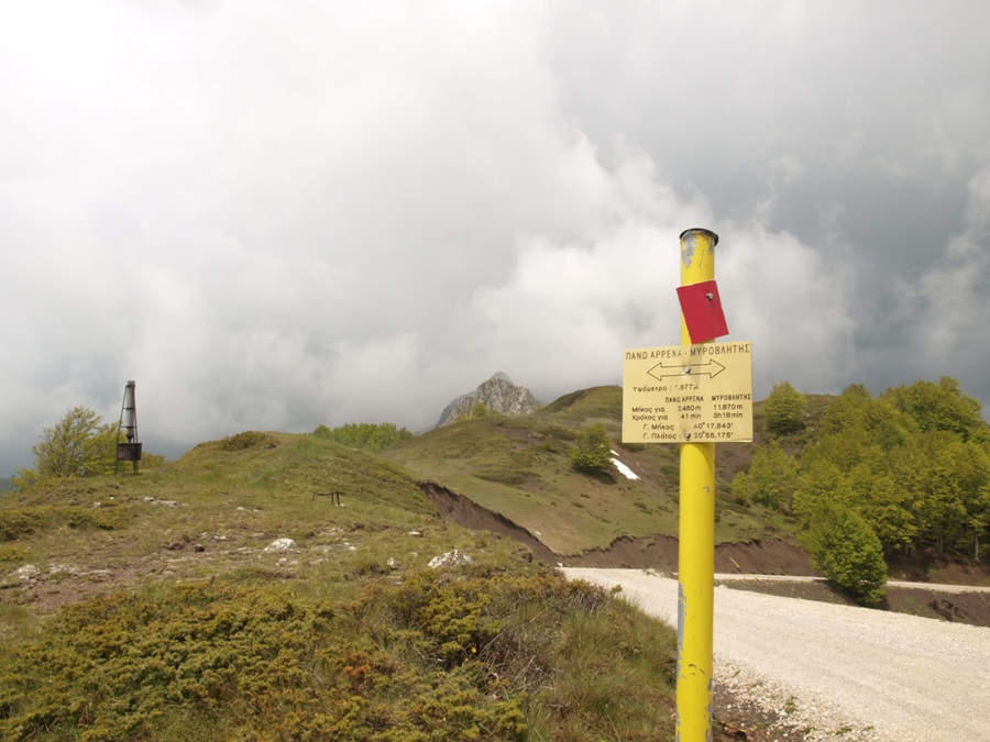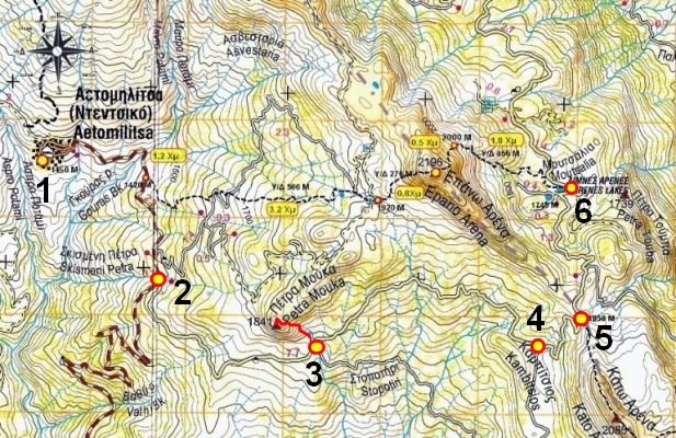 Ξεκινάμε από την πλατεία της Αετομηλίτσας (1) με υψόμετρο 1450Μ και με κατεύθυνση Ανατολική Α παίρνουμε τον ασφαλτόδρομο και σε 2,6Χμ αμέσως μετά από δεξιά στροφή συναντάμε διασταύρωση με χωματόδρομο αριστερά μας (2).
