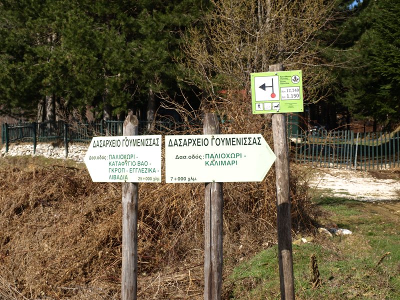 Ξεκινάμε την διαδρομή αριστερά μας Δυτικά Δ μπροστά από το παλιό ξυλόσπιτο του δασαρχείου (1), όπου βρίσκονται σχετικές πινακίδες κατεύθυνσης για τους δυο δασικούς δρόμους που διχάζονται στο σημείο αυτό αλλά και οι δυο καταλήγουν στην θέση «ΒΑΟ» και «Τούρκικη Βρύση» όπου είναι και καταφύγιο του Π.Ο.Ο Γιαννιτσών κάτω από την Νοτιοανατολική πλευρά της κορυφής «Γκόλα Τσούκα». Ο δρόμος Αριστερά μας κατηφορίζει ακολουθώντας Νότια πορεία και καταλήγει σε 13 Χμ. περίπου στο καταφύγιο του Π.Ο.Ο Γιαννιτσών. Εμείς θα πάρουμε τον δασικό δρόμο δεξιά μας, (Προς ΚΑΛΙΜΑΡΙ).