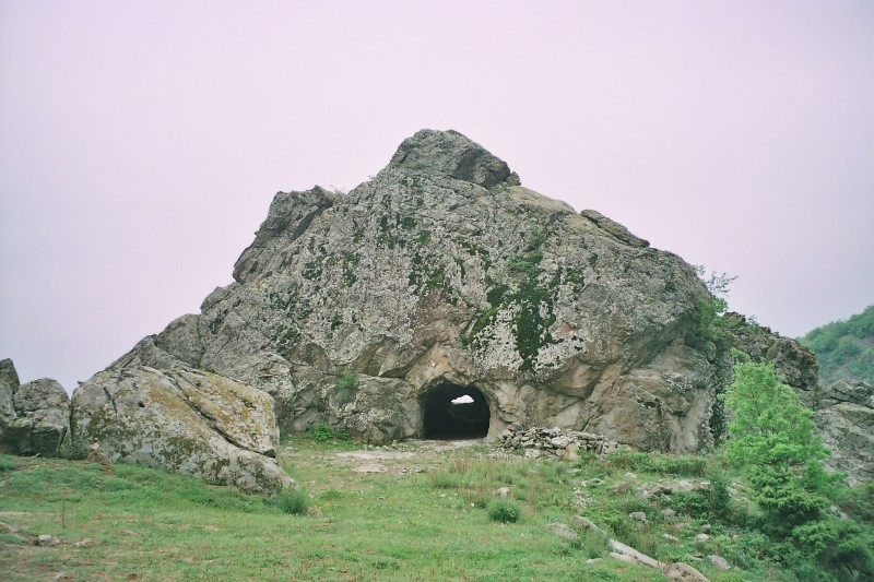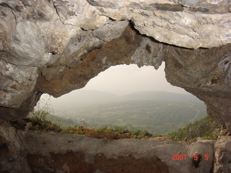 4 Ο βράχος που είναι η σπηλιά όπως φαίνεται από τον κάμπο. Στον κύκλο το παράθυρο.