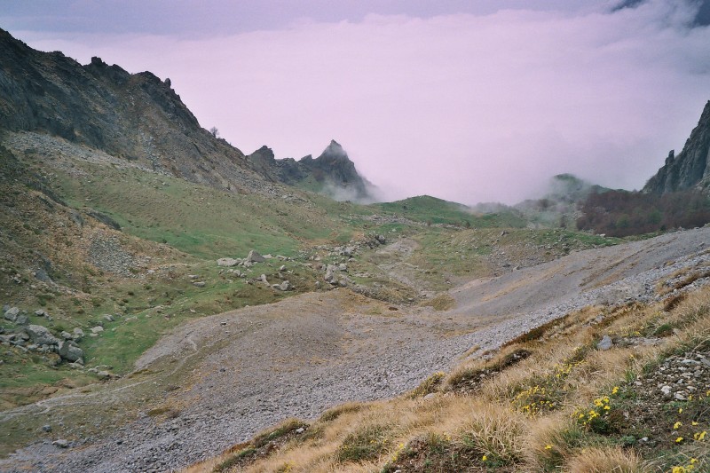 Ήμαστε στην αρχή της «Κοιλάδας των βράχων», απότομης πλαγιάς με ανάγλυφο σε πολλά επίπεδα, από παντού τρέχουν νερά και είναι διάσπαρτη με ογκόλιθους. Αριστερά μας έχουμε τις κάθετες πλαγιές του Μαύρου Βράχου, δεξιά του Καλόγερου, βόρια μπροστά μας επιβλητικό το «Βίσογκραντ». Από το σημείο αυτό και πάνω η σήμανση είναι προβληματική και πορεία μας ασαφής όμως δεν δημιουργείτε πρόβλημα προσανατολισμού, κατευθυνόμαστε με Βόρεια Β κατεύθυνση σχεδόν στο κέντρο της κοιλάδας αλλάζοντας επίπεδα με προορισμό ψηλά σε χαρακτηριστικό βράχο στο κέντρο του ορίζοντα της κοιλάδας. Από το ρέμα (5) προχωράμε στα δεξιά στην ρίζα του βράχου, τον προσπερνάμε και κατευθυνόμαστε προς το κέντρο της κοιλάδας από ασαφή μονοπάτια, ώσπου να δούμε στο βάθος στο τέλος της κοιλάδας χαρακτηριστικό βράχο να δημιουργεί δυο πύλες «πόρτες» για την έξοδο από την κοιλάδα. Προχωράμε προς τον βράχο, στην ρίζα του αριστερά έχει πυγή με νερό που είναι και το τελευταίο νερό που βρίσκουμε, και δεξιά ερείπια κτίσματος, στα δεξιά και αριστερά του έχει κομμάτια των «Συμμαχικών δρόμων» από τον πρώτο παγκόσμιο πόλεμο (6).