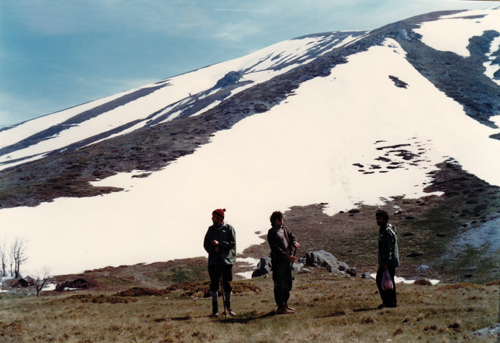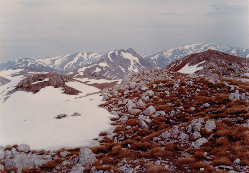 Απέναντί μας η κορφή στεφανωμένη με σύννεφα. Ανάμεσά σε μας και στην κυρία 2156 μέτρα ένα απότομο βύθισμα που μαστόρεψε η φύση. Αμέτρητοι βράχοι λειασμένοι από τα χιόνια και το νερό, τεράστιοι, στο τέλος του δρόμου τους, αρχαίοι, ο ένας πάνω στον άλλο. Λιβάδια με κίτρινο χόρτο και ταπέτα με τα πρώτα αγριολούλουδα ανακατεμένα με άσπρες στάμπες χιονιού.