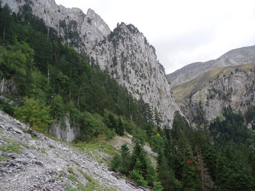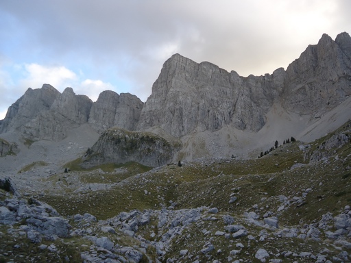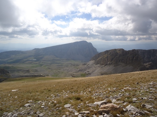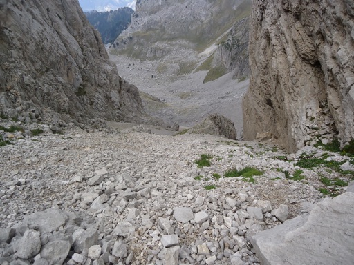 Θα συνεχίσω χωρίς μονοπάτι και σήμανση προς το πέρασμα καρτερού.Θα παρακάμψω την γκαμήλα 2 κα την γκαμήλα 3(?) και θα βγω στο πέρασμα καρτερού.Θα το κατέβω με προσοχή,παρολα αυτά θα μου φύγουν κάποιες πέτρες (ευτυχώς ήμουν μονος).Στη βάση του περάσματος θα φύγω αριστερά (βορειοδυτικά)για το σιάδι μύγας.Έδω λείπουν κάποια σημάδια αλλά η πορεία είνα εμφανής.Το τοπίο φοβερό αλπικό με τις κορυφές να κρέμονται από πάνω.