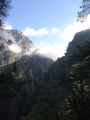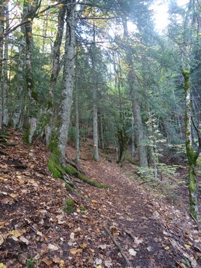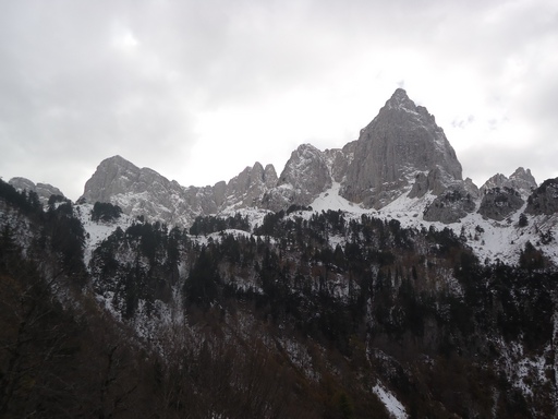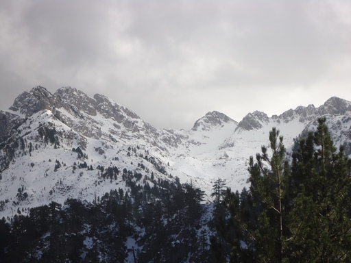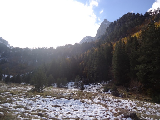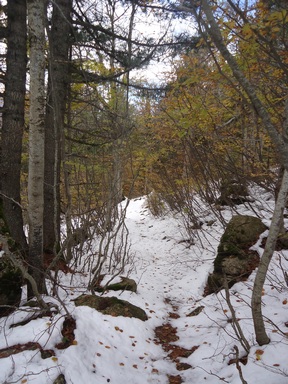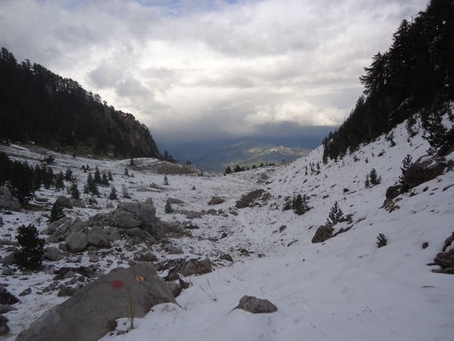 Έτσι πέμπτη πρωι στις 8 και κάτι θα ξεκινήσω από κόνιτσα και από το γεφύρι θα ανέβω στην μονή στομιου.Έχω αρκετό βάρος γιατι θα διανυκτερεύσω ένα βράδυ και επίσης κουβαλώ μαζί μου κραμπόν-πιολέ.Δεν ξέρω αν ήταν υπερβολή για την εποχή αλλά το σκεπτικό μου ήταν πως θα περάσω νωρίς το πρωι από υψόμετρο 2300(διάσελο μεγάλων λθαρίων-τσούκας ρόσσας)και το βράδυ έχει χαμηλές θερμοκρασίες.Τελικά δεν τα χρειάστηκα.Θα συνεχίσω και στην δέση θα εφοδιαστώ αρκετό νερό γιατί ξέρω πως δεν θα ξαναβρώ μέχρι την επόμενη μέρα(και επέλεξα μην κουβαλώ καμινέτα κτλ για να λιώσω χιόνι).Η διαδρομή είναι τέλεια με το δάσος να έχει πάρει τα φθνοπωρινά χρώματα και τις πλαγιές ψηλότερα χιονισμένες.Θα φτάσω στο σιάδι μύγας και από δω και πέρα ξεκινούν τα χιόνια.Οσο ανεβαίνω υψόμετρο το χιόνι είναι περισσότερ,μαλακό και απάτητο κα με καθυστερεί περισσότερο από όσο νομιζα.Πάντως απολαμβάνω την διαδρομή,θα περάσω και ένα σημειό ανοικτό με θέα προς το σμόλικα και βλέπω και το βρυσοχώρι.Η διαδρομή είναι πολλή καλά σηματοδοτημένη αλλά με την αφηρημάδα μου θα χάσω λίγο τα σημάδια στα χιόνια και θα βγώ λίγο ψηλότερα στον αυχένα πριν αρχίσω να κατηφορίζω για τον κάτσανο.Με λιγη ταλαιπωρία θα ξαναβγώ στο μονοπάτι και θα κατέβω στον κάτσανο στις 3.30 το μεσημέρι.Το τοπιο είναι χειμερινό με τις χιονισμένες ορθοπλαγιές να σε καθηλώνουν.Θα συνεχίσω προς τα πανω,υπάρχουν πλέον και πράσινα σημάδια που με βοηθούν μεσ τα χιόνια και θα προσπαθήσω να ανέβω όσο δυνατόν ψηλότερα για να διανυκτερεύσω ώστε να κερδίσω χρόνο για την επόμενη μέρα που πρέπει να φτάσω στο σκεμνέλι μέχρι τις 3.Καθυστερώ αρκετά πλέον γιατί το χιόνι είναι πολύ μαλακό και ανοιγώ συνέχως βήματα και με το βάρος που χω βουλίαζω αρκετά.Τελικά στις 5 θα βρω ένα μικρό ισιωμα καπου στα 1800 και θα στήσω το αντισκηνό μου.Το βράδυ έριξε ένα πολύ ελάχιστο χλιαρο χιονόνερο που όμως θα μαλακώσει κι άλλο το χιόνι.