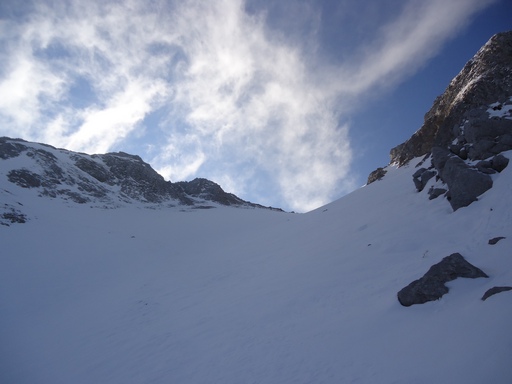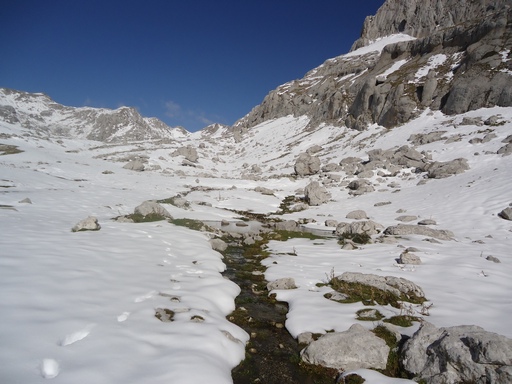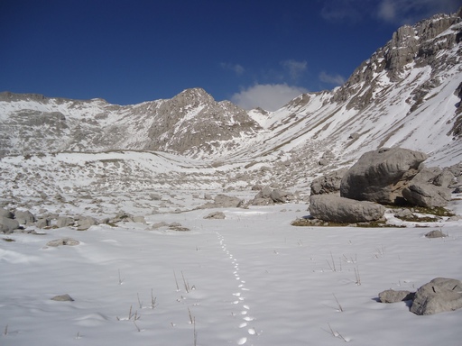 Θα ξεκινήσω με το πρώτο φως και αργά αργά θα φτάσω στην μεγάλη λεκάνη πριν το διάσελο.Κάθε μου βήμα με δυσκολεύει,μετράω 5αδες,10αδες,20αδες βήματα και σταματώ για ξεκούραση.Πίσω μου έχει βγάλει ομιχλη και μπροστά μου (στο διάσελο)τα σύννεφα κινούνται πολύ γρήγορα,πότε ανοιγώντας και πότε κλείνωντας την ατμόσφαιρα.Καθυστερώ αρκετά και έχω αγχωθεί λίγο αν θα προλάβω να φτάσω στο σκαμνελι πριν τις 3.Γύρω στις 10.30 θα φτάσω στο διάσελο.Είμαι τόσο κουρασμένος που δεν έχω την αντοχή να κάνω την παράκαμψή για να δω την θέα από την τσούκα ρόσσα(άσε που συχνά τα σύννεφα την κρυβουν και δεν το ρισκάρω να πάω).Από το διάσελο βλέπω πλέον μπροστά μου την γκούρα,το βλάσι και το κρεβατί καθώς και την χαρακτηριστική διαδρομή για το τσεπέλοβο.Κατεβαίνω δεν βρίσκω την πηγή γκούρα και θα γεμίσω νερό από ένα ρεματάκι.Το τοπιο είναι πανέμορφο,έχει δημιουργηθεί μια λούτσα και ένα ρεματάκι ανοίγει το χιονισμένο έδαφος.Μέχρι εδώ υπάρχουν σημάδια,μετά δεν βρήκα άλλα μέχρι το σκαμνέλι.Θα ακολουθήσω όμως ένα λάστιχο (είχα διαβασει παλια στο ανεβαίνοντας πως το ακολουθείς ως το σκαμνέλι) και θα περάσω από ένα δάσος από πέτρες.Φτάνω στο δρόμο και συναντώ στάνη,κάπου εδώ δεν βλέπω πια το λάστιχο.θα ανηφορισω την πλαγια και θα κατέβω απότομα να ξαναπάρω το δρόμο και θα βγάλω χάρτη πυξίδα να δω προς τα που είναι το σκαμνέλι.Θα κόψω τον δρόμο αρκετές φορές στις φουρκέτες και στο τέλος θα πάρω ένα μονοπατί δεξιά απο χαρακτηριστικό πευκοδάσος που θα με βγάλει στο σκαμνέλι στις 1.30.
