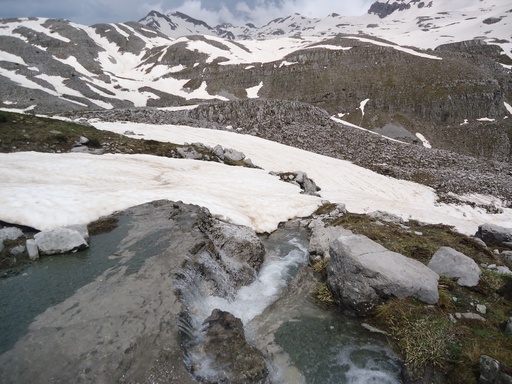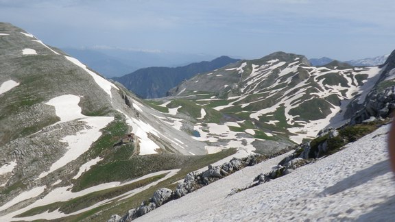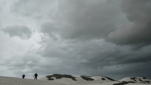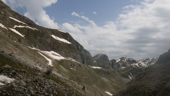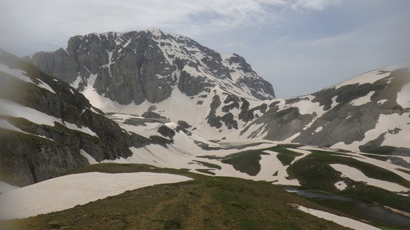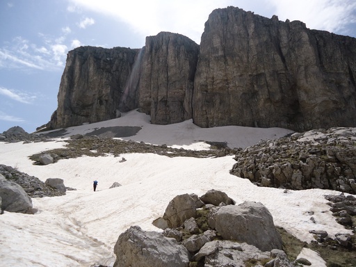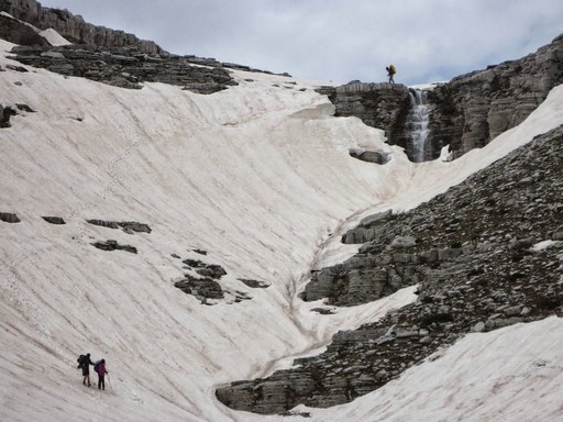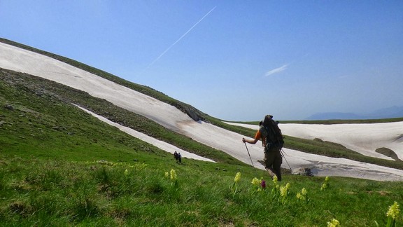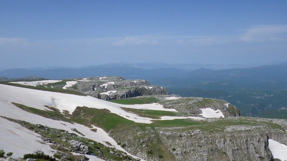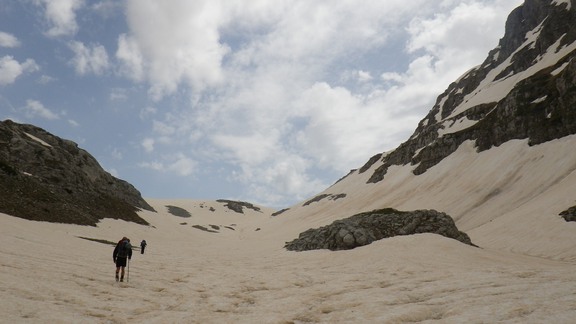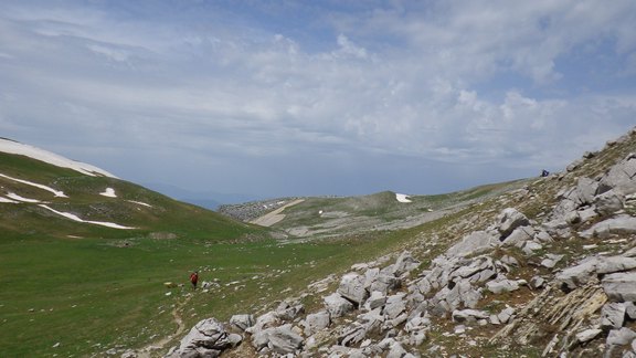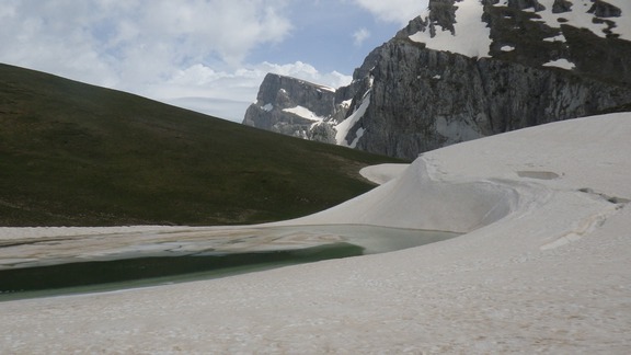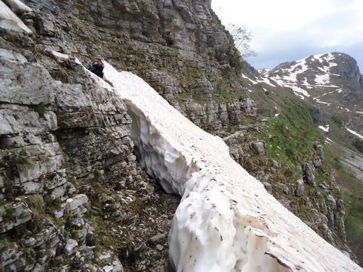 Από το καταφυγιό κατεβαίνουμε προς πάπιγκο και λίγο μετά την πηγή κρούνα πάμε προς την προβατίνα.Περπατάμε πάνω από τους πύργους του πάπιγκου με τις εποχές να εναλλάσονται από ανοξη σε χειμώνα και φτάνουμε στο τεράστιο λιβαδι στην τοποθεσία γκοβόστίτσα.Υπέροχη διαδρομή σχετικά άγνωστη στην τύμφη(και μεις από σπόντα περάσαμε από κει).Περνάμε το διάσελο του αηλια και τωρα έχει αρκετό χιόνι και καθυστερούμε.Πίσω μας ο ουρανός μαυρίζει και μας πιάνει ανησυχία καθώς μεσημεριάζει.Τελικά η καταιγίδα έρχεται.Έχουμε πάνως μας αρκετά σιδερικά(π.χ. πιολέ).Πολύ φόβος,ευτυχώς οι κεραυνοί έπεφταν πιο μακρυά και μετά βγαίνει ο ήλιος.Περνάμε και το νέτο και το κεντρόσι με προσοχή στο προσανατολισμό γιατί είμαστε στα χιόνια και αρχίζουμε να βλέπουμε τον μέγα λάκκο.Το τοπίο είναι παρα παρα πολύ μαγικό.Καταρράκτες από χιόνια που λιώνουν και ποταμάκια και γύρω τους πάγος.Εχουμε αργήσει και αποφασιζουμε να χωριστούμε.Οι 2 που μπορουμε να παμε πιο γρήγορα φεύγουμε μπροστά(ο ένας από τους άλλους έχει και το γονατό του),θα παμε να να παρουμε το αμάξι και θα δίνουμε ραντεβου στο δρόμο προς βραδετο για να γλιτωσουν 2 ωρες..Περνάμε την πηγή κρούνα και παμε από τα ζωνάρια κρούνας κατω από την καζάρμα.Το μονοπάτι στενό,δεξιά μας 200/300 μετρα καθετιλα ο γκρεμός του μέγα λάκου και μια ρωγμη από την βροχή στη μέση του μονοπατιού.Περπατάμε προσεκτικά αλλά το <<καλύτερο>> δεν το έχουμε δει ακομα.Μια γλώσσα σκληρού χιονιού μας φράζει τον δρόμο.Από την μια βράχια,απ την άλλη γκρεμός.Πως την περνάμε?Στο εσωτερικό της η χιονούρα εκεί που ακουμπα στο βράχο λιώνει ως ένα σημείο και χωράει ένα σώμα,στη μισή όμως χιονούρα συμβαίνει αυτό,μετά σκαρφαλωνουμε στα βράχια,παει πρώτα ο φιλος μου τα καταφέρνει να την περάσε και να κατέβει στο στενο μονοπατι που είναι ένα μικρο παταράκι και από κατω γκρεμος,του δινω το σακιδιο μου και με βοηθάει να κατέβω και γω.Παιρνω τηλέφωνο τους πίσω να μην έρθουν από εδώ,φυσικά το χουν κλεστό,ευτυχως πηγαν από τζάνοβα.Συνεχίζουμε και αφου περάσουμε από δολίνες με την βοήθεια της πυξιδας θα βγούμε στην στάνη-λουτσα κάτω από το ψωροβούνι.Παιρνουμε το ρέμα ,εδώ οι πέτρες είναι σαν να έχουν φυτρώσει αντί για δέντρα.αποφασίσαμε να βγούμε στο δρόμο του βραδέτου(εκεί που είχαμε ραντεβου με τους άλλους) και να κάνουμε ωτοστοπ για καπεσοβο γιατί η ωρα έχει περάσει και ξαναερχόταν καταιγίδα.Αφου φέραμε το αμάξι μιλάμε με τους άλλους και έχουν κάνει λάθος και έχουν πάρει το μονοπάτι απο την λούτσα τζάνοβα για τσεπέλοβο!οπότε πάμε και τους παίρνουμε από κει λίγο πριν νυχτώσει με την καταιγίδα να χει μόλις ξεκινησει.