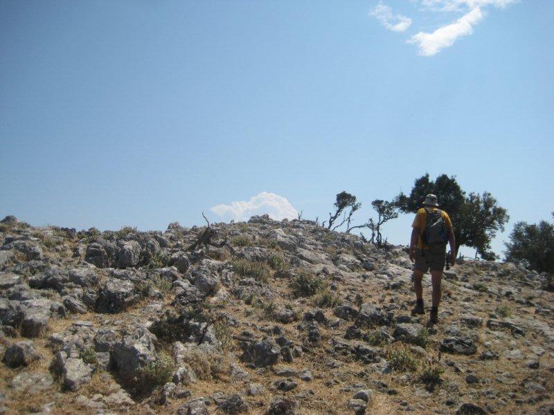 Όταν ξαναβγήκαμε στην άσφαλτο κοντά στο κτίριο του Δασαρχείου είδαμε στην άλλη μεριά του δρόμου ξεκίνημα μονοπατιού με σκαλάκια και μια ταμπέλα που έλεγε ότι το μονοπάτι οδηγούσε στο «Ξηρό όρος». Ούτε ήξερα ότι υπήρχε τέτοιο βουνο. Δεν θέλαμε και πολύ να το αποφασίσουμε. Είχα και το gps στο αμάξι για να καταγράψω τη διαδρομή. Το μονοπάτι ξεκινάει από τα 650 μ. περίπου και κινείται μέσα σε όμορφο ελατόδασος. Στην αρχή είναι κι αυτό διαμορφωμένο με ξύλινα κάγκελα, γεφυράκια, κλπ. Είναι όπως καταλαβαίνετε σαφέστατο και καλά σηματοδοτημένο. Μετά από 15’ περίπου φτάνουμε σε χωματόδρομο και τον ακολουθούμε προς τα αριστερά για 250 μ. περίπου. Ξαναπαίρνουμε το μονοπάτι προς τα δεξιά και σε 5’ περίπου φτάσαμε σε πλάτωμα με διαμορφωμένο χώρο αναψυχής, με κούνιες και τραπέζια, δίπλα σε δρόμο. Το μονοπάτι δεν ακολουθεί το δρόμο αλλά στρίβει δεξιά και συνεχίζει να κινείται ανηφορικά μέσα στο όμορφο ελατόδασος. Σε 45’ περίπου βγήκαμε στη γυμνή κορυφογραμμή και την ακολουθήσαμε (για πολύ λίγο) μέχρι την κορυφή (990μ.) με το κολωνάκι και την όμορφη θέα από τον Ευβοϊκό μέχρι το Αιγαίο και από το Καντήλι και τη Δίρφη μέχρι το Πήλιο και τον Άθω. Δεν κάναμε πάνω από 1:15’ πολύ τεμπέλικης και πολύ όμορφης διαδρομής για να φτάσουμε στη κορυφή.