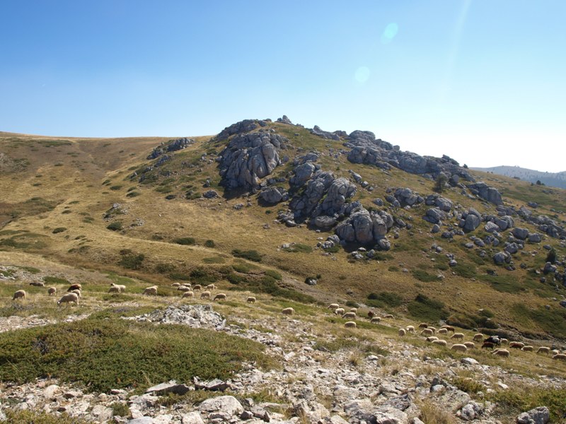 11 Ανάγλυφοι βράχοι Δυτικά της κορυφής «Γραμμένη Πέτρα». Κοπάδια με πρόβατα διάσπαρτα παντού.