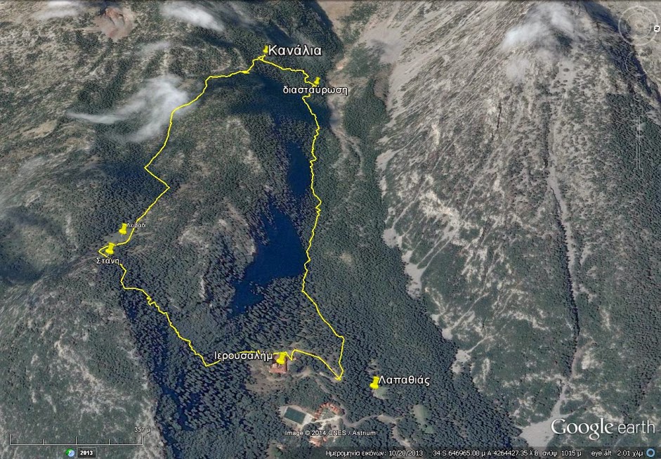 Κυριακή 22 Ιούνη, 6 πμ ξεκινήσαμε από Ιερουσαλήμ και στις 7,30 ήμασταν στη διασταύρωση που φεύγει δυτικά για Ακρινό νερό και νότια για Κανάλια. Πήγαμε Κανάλια καθώς στις 10 έπρεπε να είμαστε πίσω (αντάμωμα Σαρακατσάνων της Βοιωτίας στο Λαπαθιά). Γυρίσαμε από το νότιο μονοπάτι. Ωραία διαδρομή, δύσκολη μόνο στο κομμάτι από την Στάνη μέχρι το Μοναστήρι.