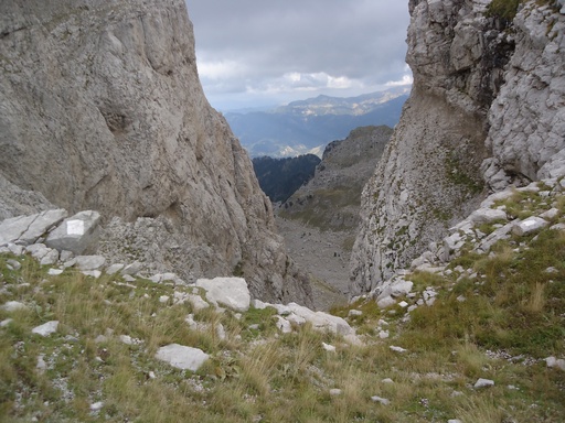 Θα συνεχίσω χωρίς μονοπάτι και σήμανση προς το πέρασμα καρτερού.Θα παρακάμψω την γκαμήλα 2 κα την γκαμήλα 3(?) και θα βγω στο πέρασμα καρτερού.Θα το κατέβω με προσοχή,παρολα αυτά θα μου φύγουν κάποιες πέτρες (ευτυχώς ήμουν μονος).Στη βάση του περάσματος θα φύγω αριστερά (βορειοδυτικά)για το σιάδι μύγας.Έδω λείπουν κάποια σημάδια αλλά η πορεία είνα εμφανής.Το τοπίο φοβερό αλπικό με τις κορυφές να κρέμονται από πάνω.