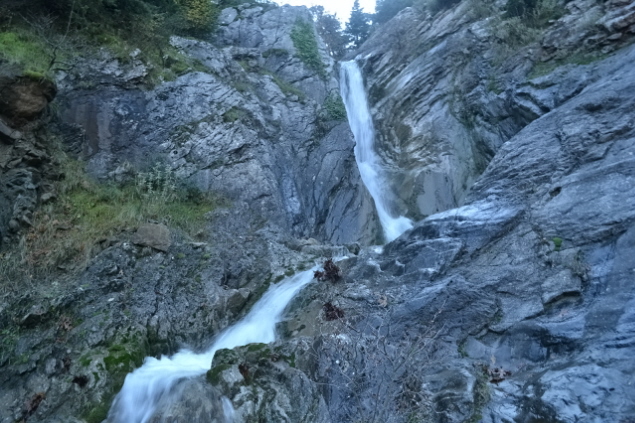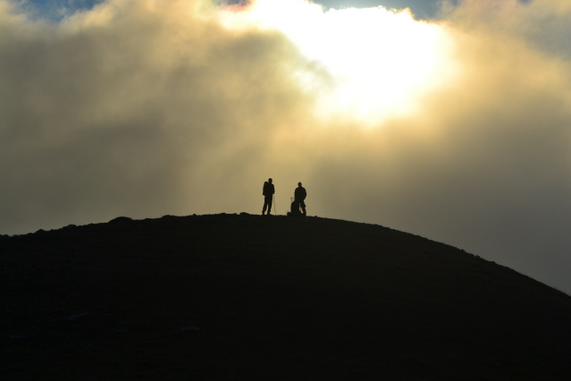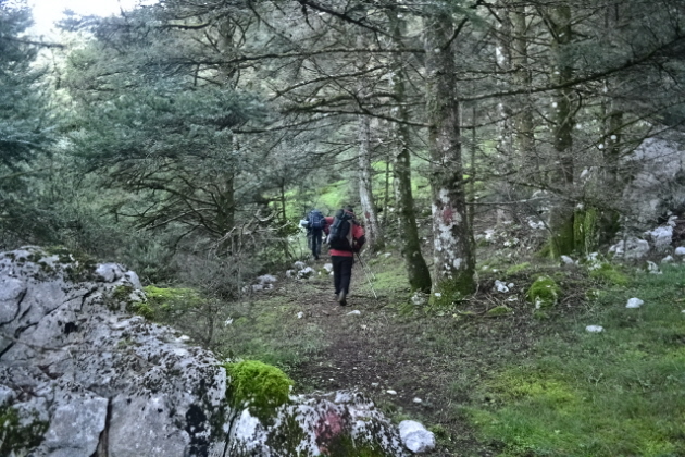 Την επόμενη μέρα , δεν πήραμε το δρόμο προς την Πάνω Αρέντα και το διάσελο, αλλά με τις οδηγίες του κυρ Λάμπρου ακολουθήσαμε τις κολώνες τις ΔΕΗ που πάνε προς την κορυφογραμμή της Καταβόθρας. Όταν βγήκαμε ψηλά το πρώτο φως έλουζε τις χτεσινές κορυφές. Η καθαρή ατμόσφαιρα έκανε το περπάτημα πάνω στη κορυφογραμμή της Καταβόθρας εξαιρετικό. Σε 1.30 από το χωριό στεκόμασταν στα 1752 της κορυφής της. Στη συνέχεια έπρεπε να ακολουθήσουμε τη κορυφογραμμή προς την Τσίνα, έτσι πήραμε τον κατήφορο για το διάσελο και σε 1.30 περίπου ώρα φτάσαμε κάτω από την Τσίνα. Για να κερδίσουμε λίγο χρόνο την παρακάμψαμε και κινηθήκαμε πάλι πάνω στη κορυφογραμμή προς το "σύνορο", ξερολιθιά πάνω στην κορυφογραμμή που οριοθετεί τα σύνορα του Λαμπιριού. Εκεί έρχεται το μονοπάτι από τον Κατελάνο και το ακολουθήσαμε για λίγο. Μετά το κατέβασμα μέχρι το ξέφωτο πάνω στον μικρό ώμο, πήραμε το φανερό μονοπάτι που φεύγει δεξιά μέσα στο δάσος και οδηγεί στο ξέφωτο της Φτέρης. Το μονοπάτι μετά από λίγο χάνεται, αλλά οι κορδέλες στα δέντρα κι ο Δημήτρης μας βοήθησαν να φτάσουμε στη Φτέρη σε λιγότερο από 1 ώρα από τη διασταύρωση και 7 περίπου από την Αρέντα. Από τη Φτέρη πήραμε το παλιό μονοπάτι, που σε πολλά σημεία έχει χαθεί, αλλά με τη προσπάθεια των Αγρινιωτών, έχει αρχίσει να διακρίνεται και πάλι. Σε λιγότερο από 1 ώρα φτάσαμε δίπλα στο ρέμα και το ακολουθήσαμε για λίγο από τη δεξιά πλευρά του. Λίγο πριν περάσουμε στην αριστερή μεριά εμφανίστηκαν και τα φρεσκοβαμμένα κόκκινα σημάδια. Από εκεί και μετά το μονοπάτι αφήνει το ρέμα κι ανεβαίνει ψηλότερα. Η διαδρομή είναι φανταστική καθώς έχει συνέχεια το ρέμα από κάτω και περνά από μπαλκόνια, ρεματάκια, καταρράκτες και απότομα βράχινα περάσματα. Στο τέλος ένα ιδιόμορφο γεφυράκι από σωλήνες και πλάκες μας βοηθά να περάσουμε στην απέναντι όχθη και να βρεθούμε σε 20΄ στο τέλος του δρόμου που έρχεται από τη Σιτόμενα, 3-4 χλμ παρακάτω. Εκεί μας περίμενε ο Θύμιος, που με το φορτηγάκι του θα μας πήγαινε πίσω στον Αγ. Βλάσση και στα αυτοκίνητά μας, πάνω από 1 ώρα δρόμος. Τον ευχαριστούμε κι αυτόν.